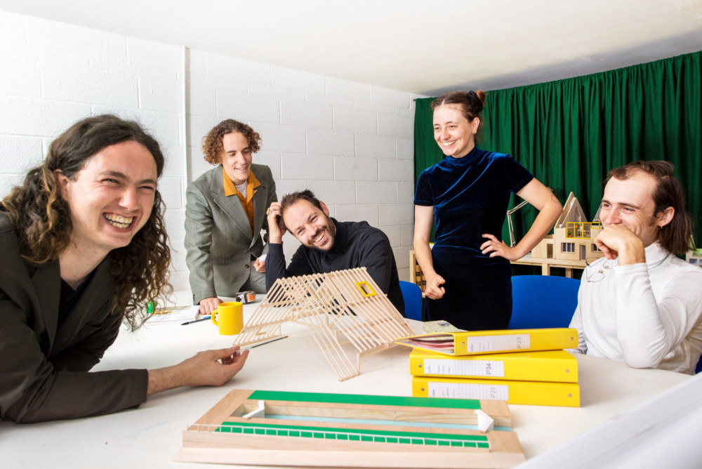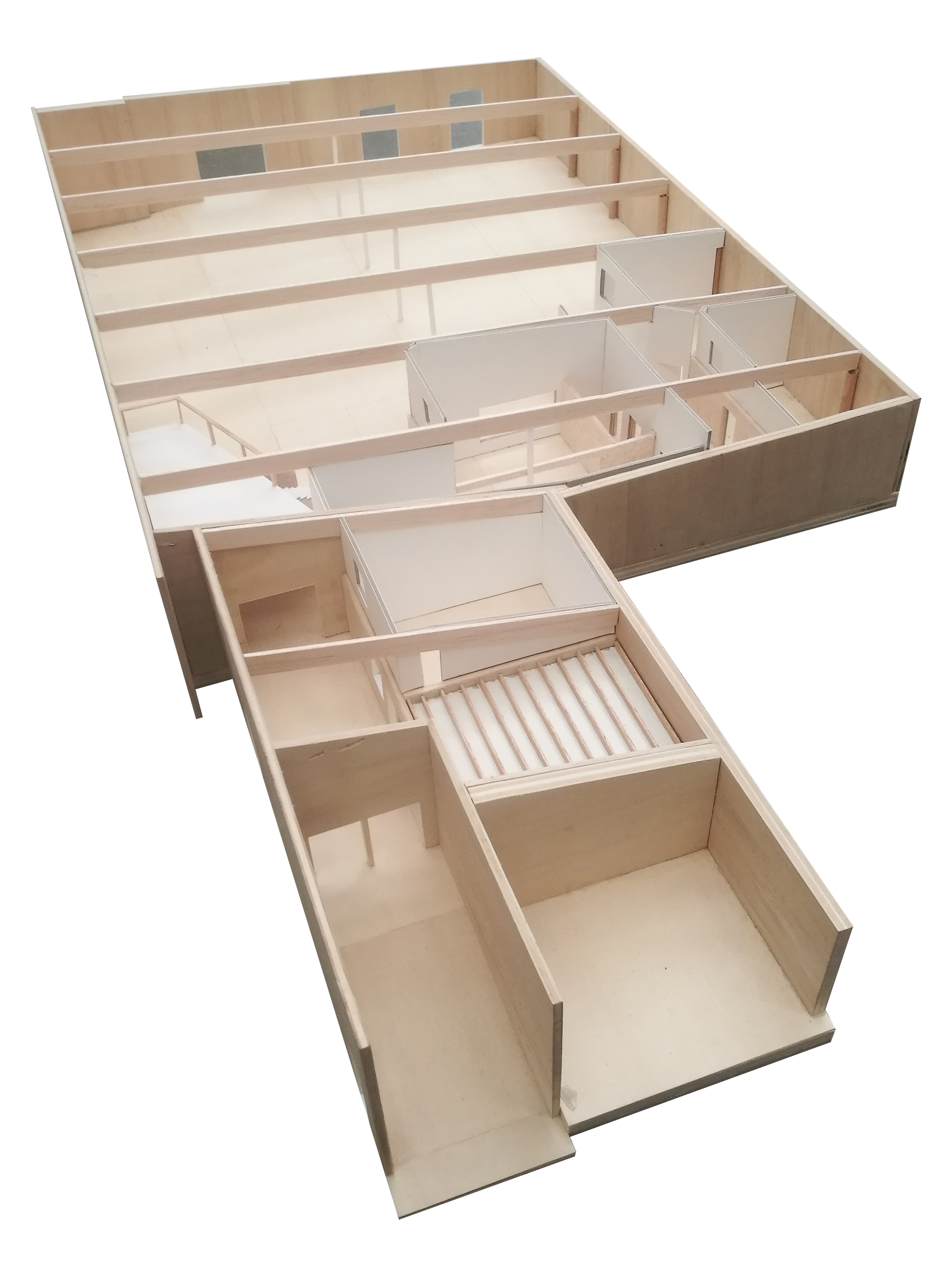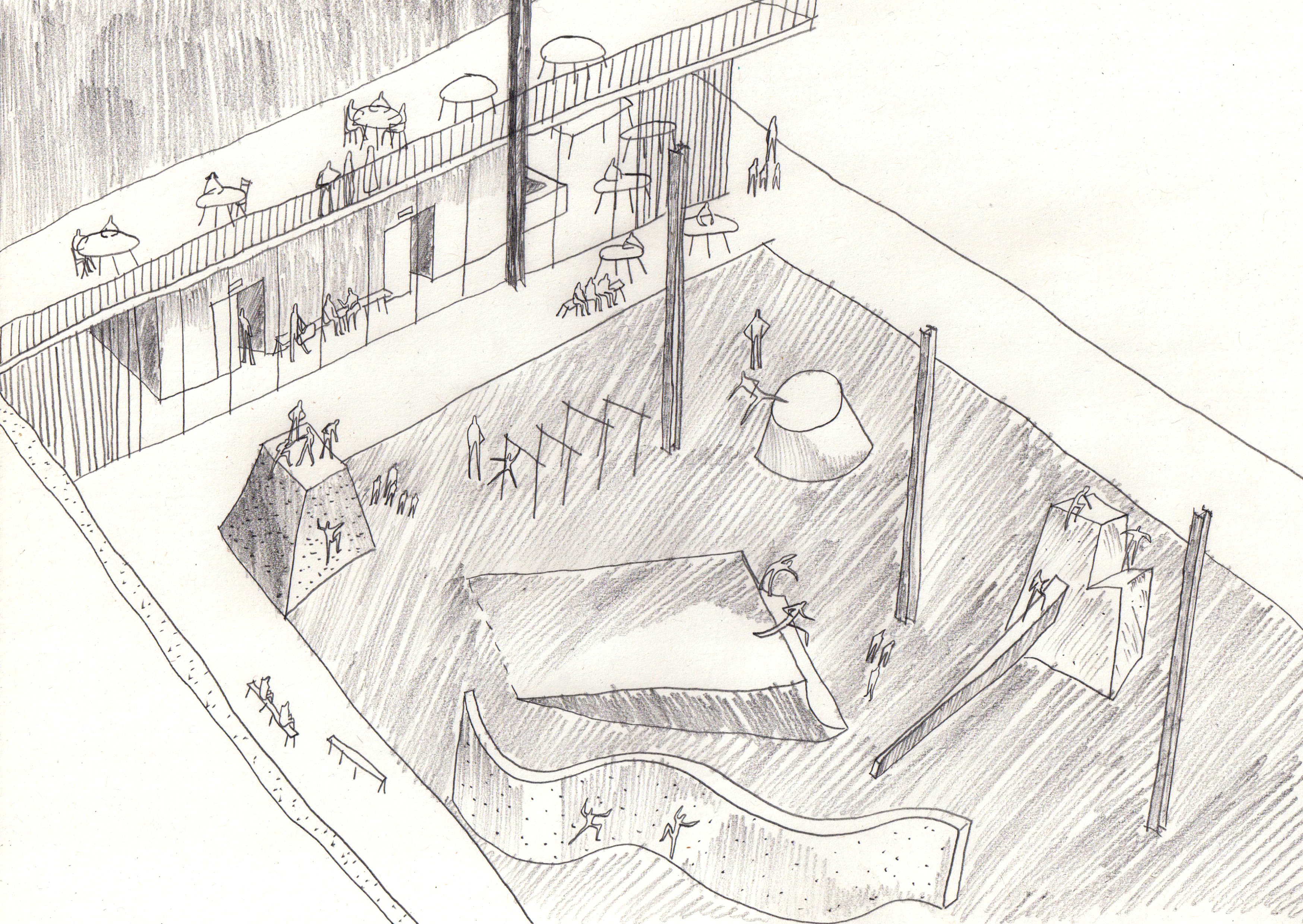 C’est par une intervention légère sur l’existant et la confection d’éléments mobiliers que le bureau devient la première “base-vie” du projet architectural qui se profile. Celui-ci consiste en l’aménagement de locaux administratifs et destinés à l’accueil des publics, ainsi qu’à l’aménagement d’une arène sportive dédiée à la pratique du parkour.