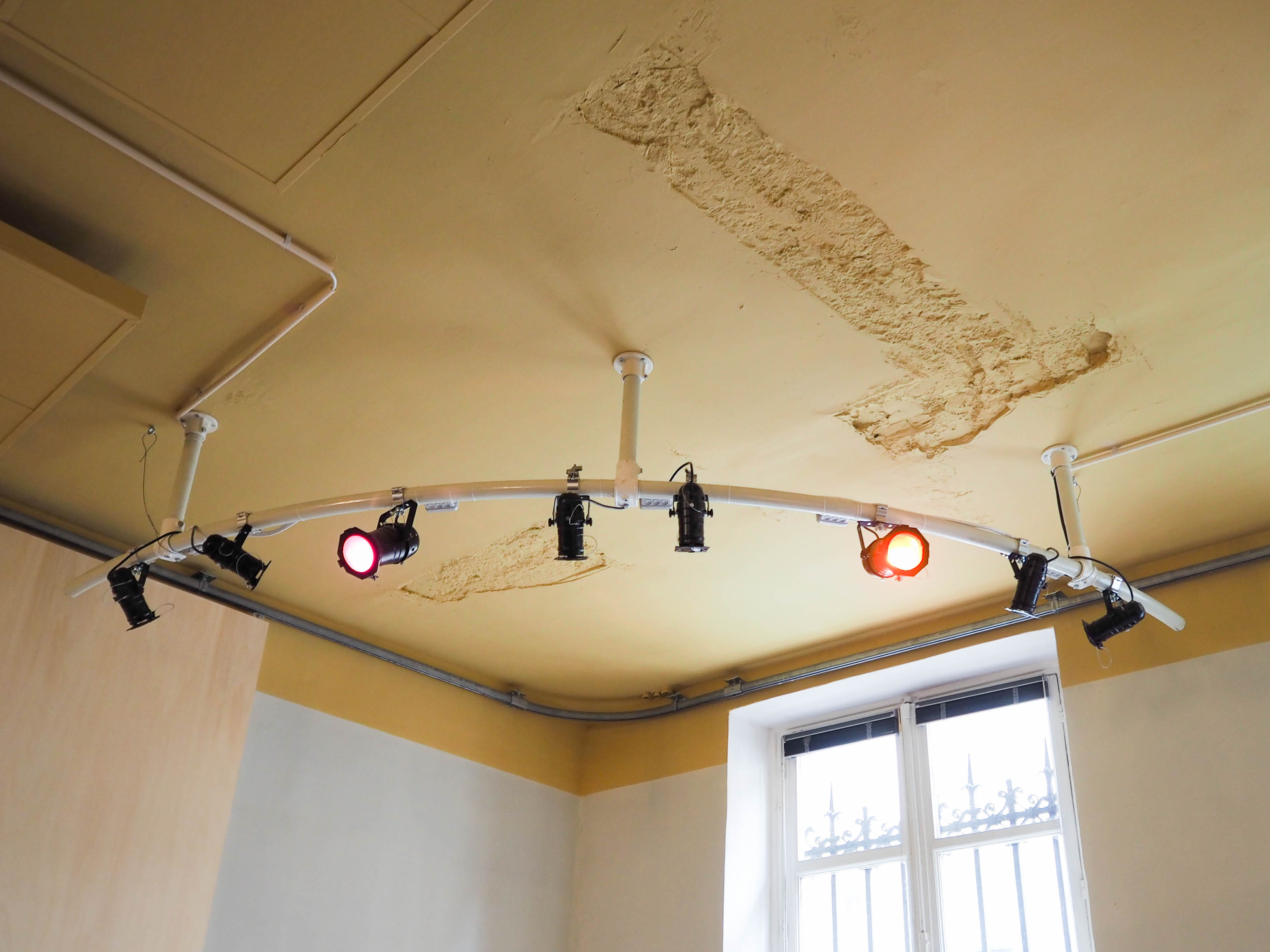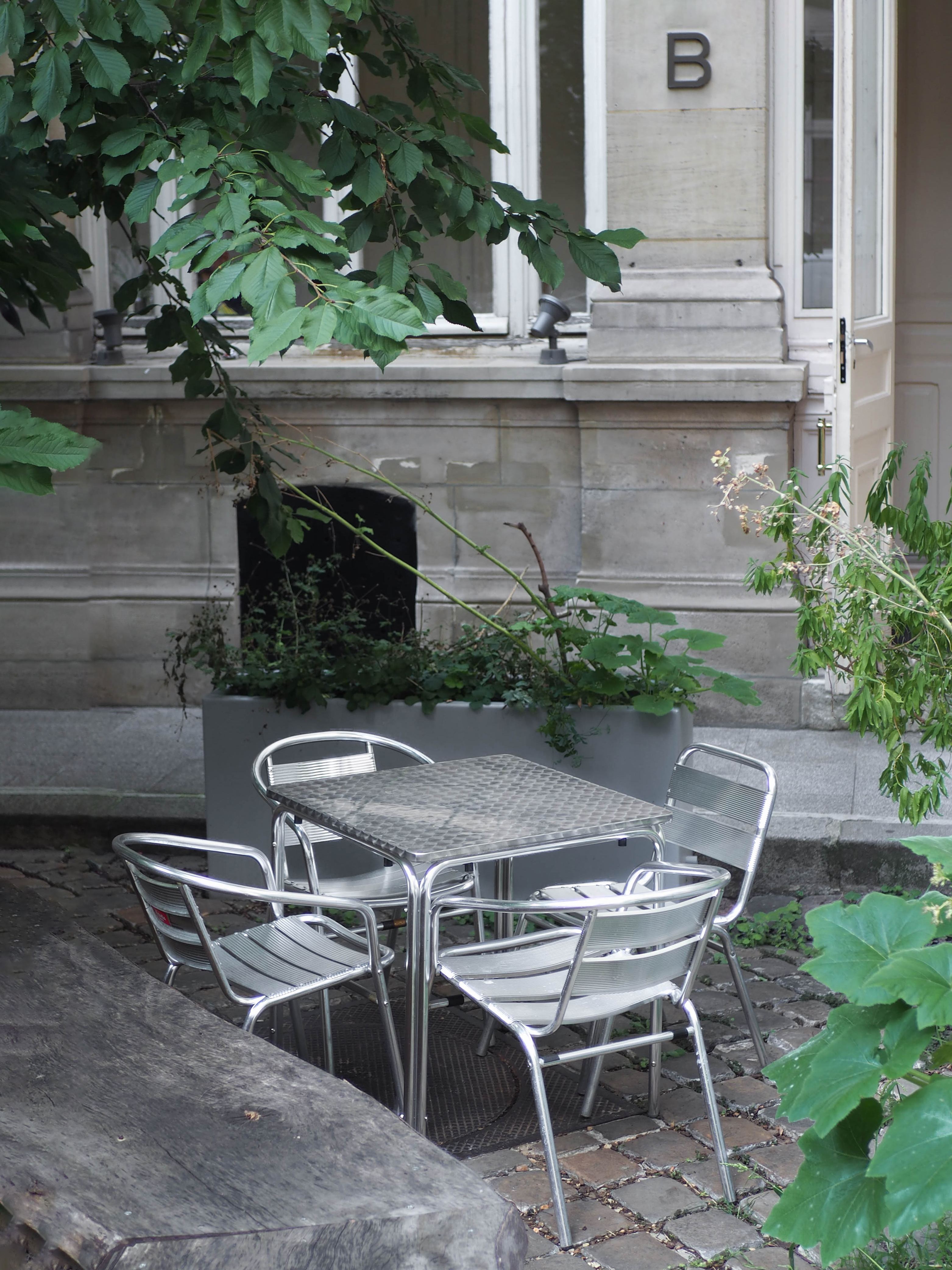 Le vocabulaire du projet prend pour point de départ l’existant, en grande partie conservé et restauré. A ceci s’ajoute un registre textile qui se décline en grands rideaux délimitant des sas thermiques et en dais, disposés aux dessus des comptoirs. Des volets intérieurs, coulissant et pivotant le long des murs sont réalisés à partir de panneaux phoniques présents sur place. Ils limitent les nuisances sonores, les soirs de fête, envers le voisinage. Le mobilier existant est sélectionné avec soin et modifié lorsque nécessaire. Des tables sont ainsi prolongées, des banquettes réunies, des luminaires adaptés et une estrade construite à partir d’éléments préexistants. Le mobilier additionnel est sourcé en seconde main dans les réseaux de réemploi régionaux. Une réflexion sur l’esthétique de la trace et des multiples vies des édifices est amorcée en soulignant par la lumière et la couleur, des sols et murs aux cicatrices laissées visibles.