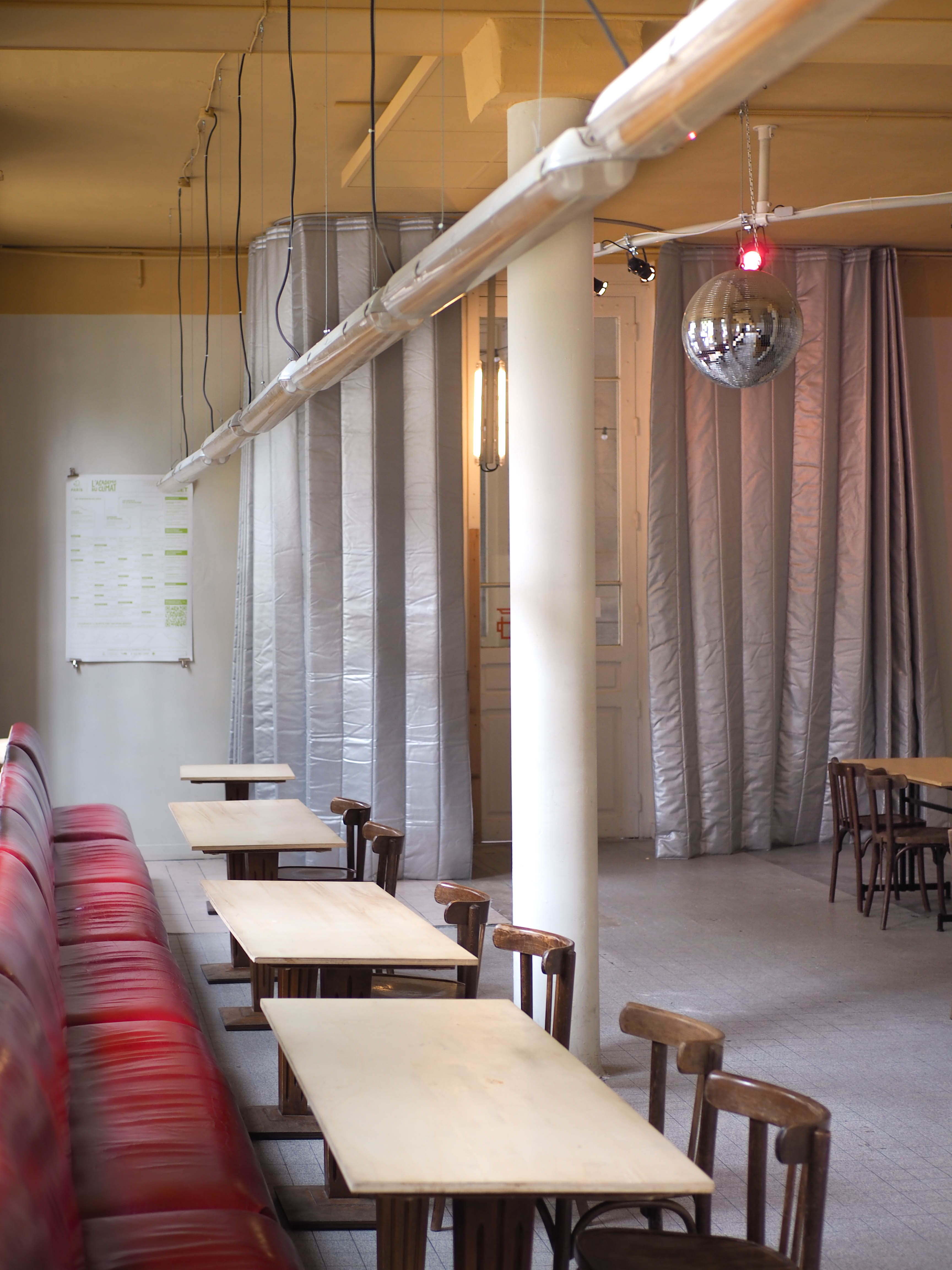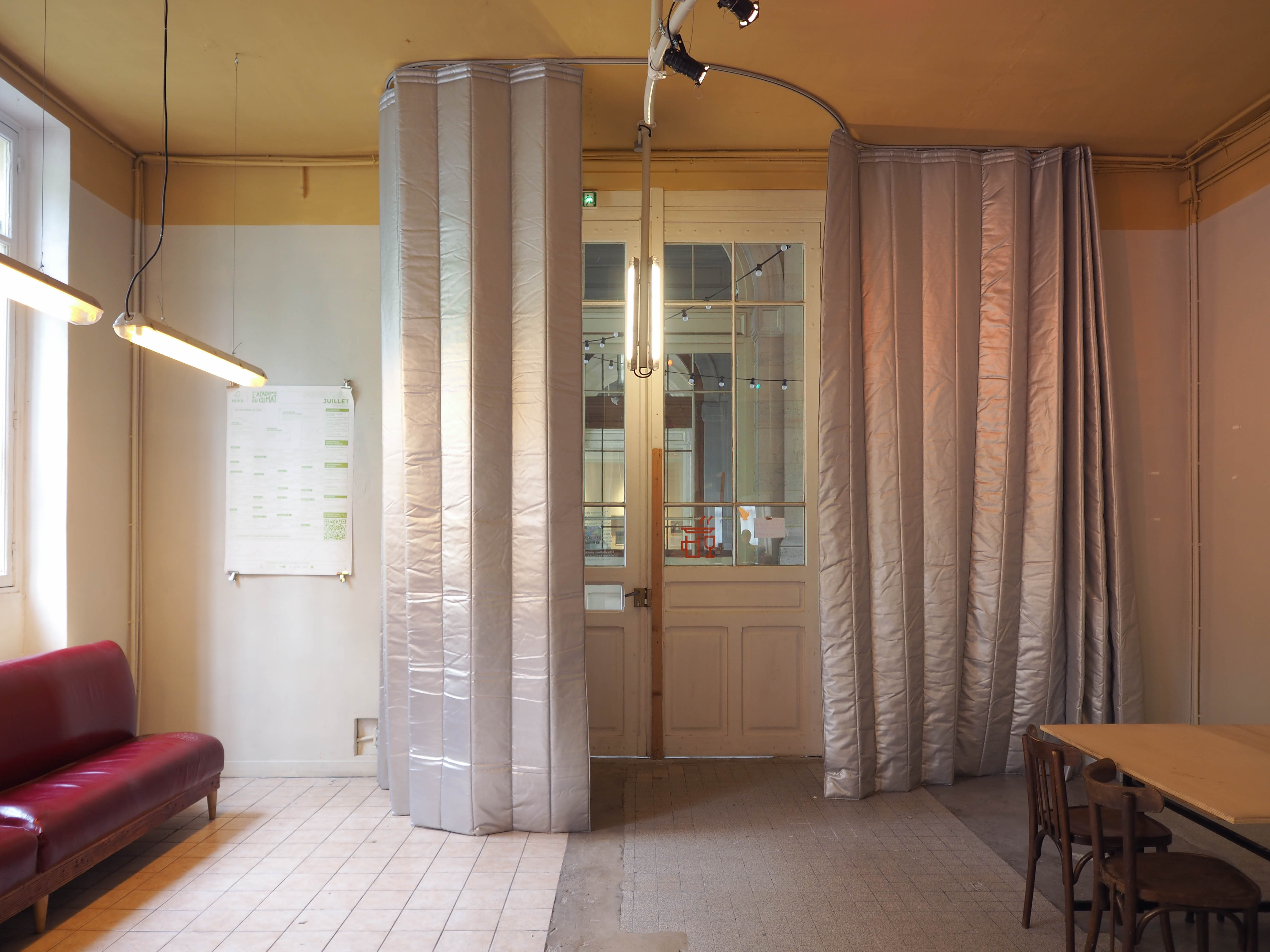 L’Académie du Climat et Yes We Camp ont fait appel à Zerm pour transformer leur buvette et l’adapter aux contraintes thermiques et phonique que la situation rencontre. Dans une logique d’économie de ressources, le projet d’aménagement s’appuie sur des éléments de réemploi et convoque des dispositifs architecturaux simples, parmi lesquels : le rideau, le volet et le sas. La commande consiste à contrer les effets de courant d’air, optimiser la distribution des espaces, apporter des améliorations thermiques/acoustiques et harmoniser le mobilier présent dans la cour, la buvette et les locaux dédiés à la réception d’événements.