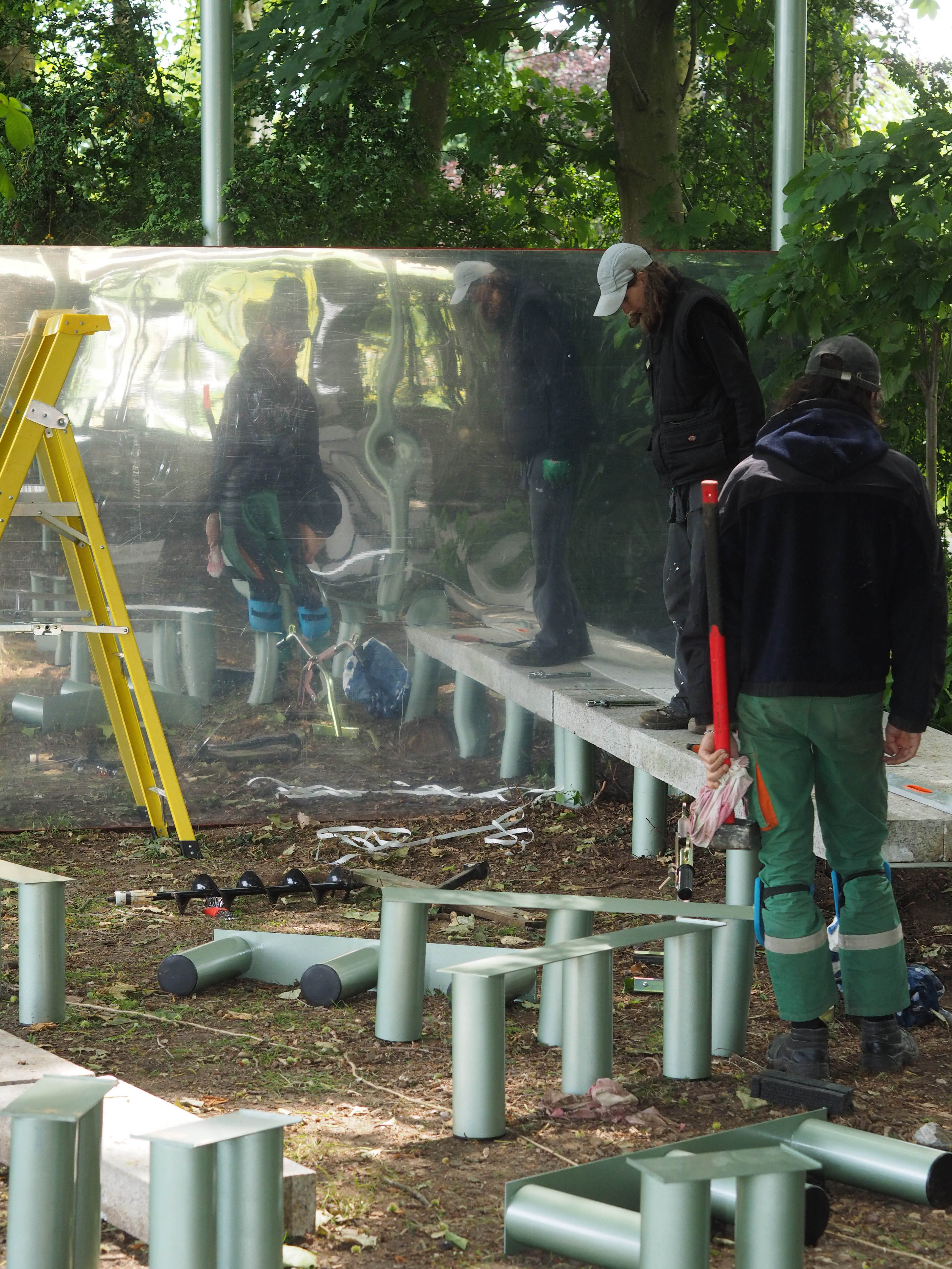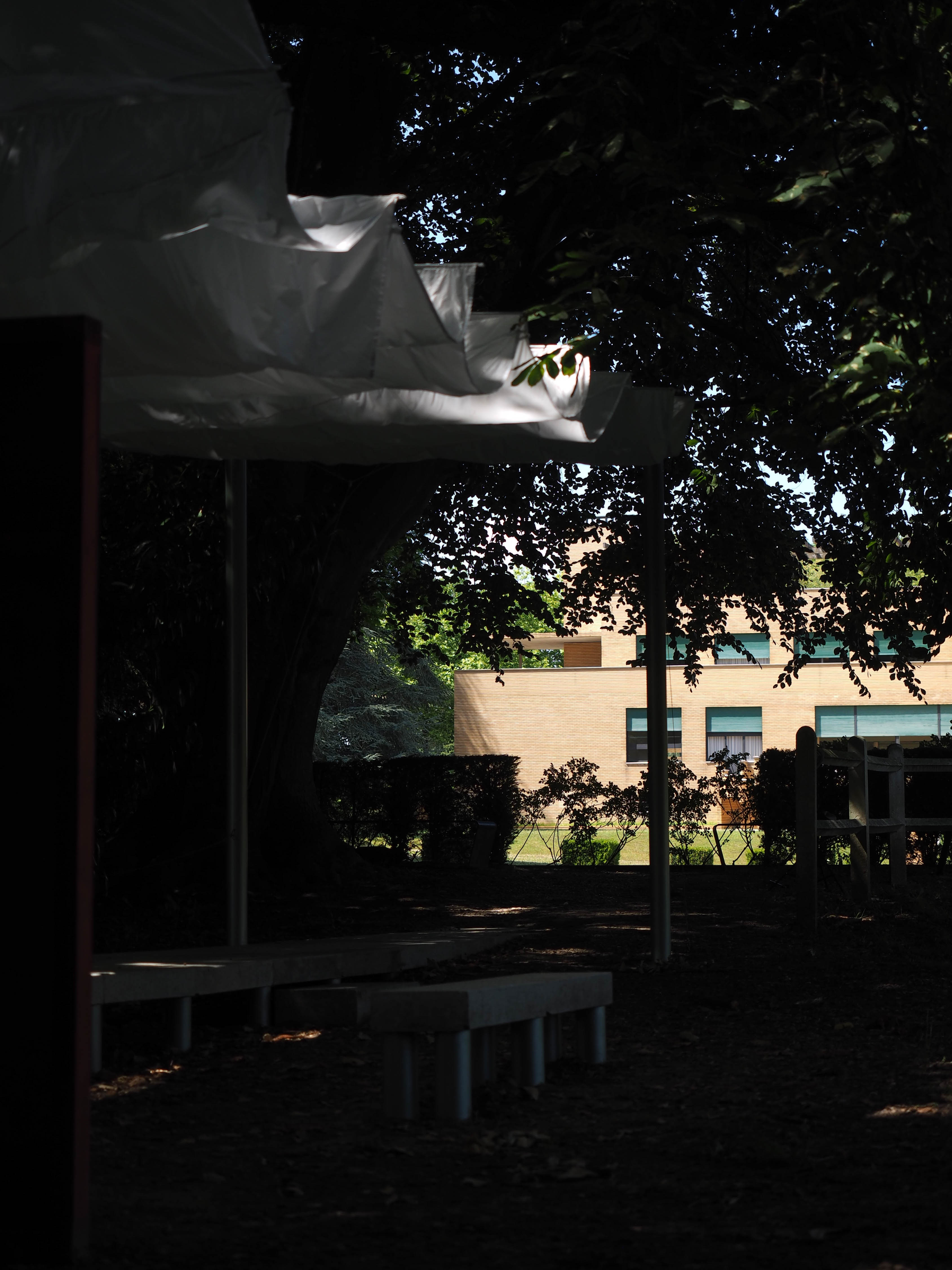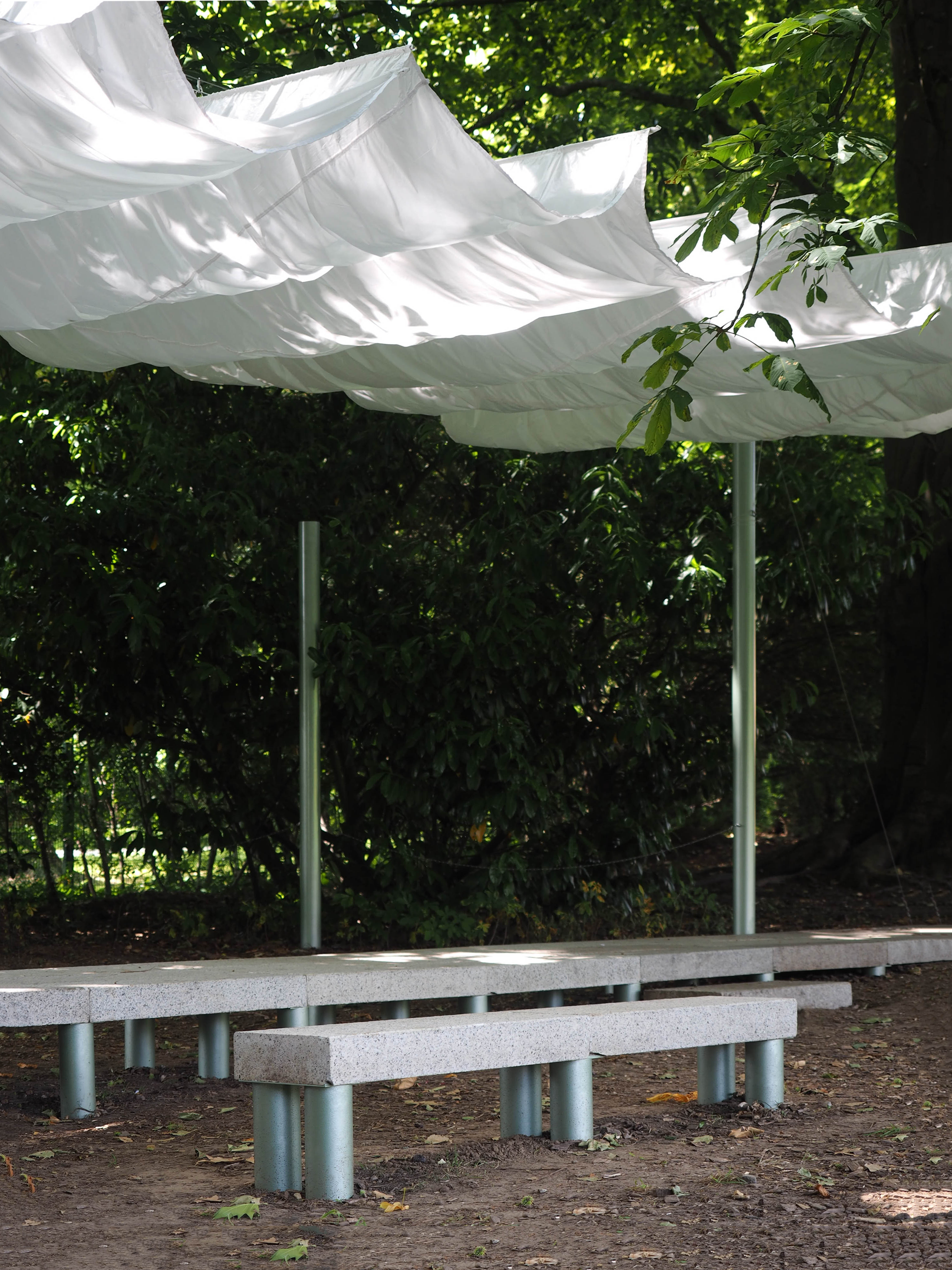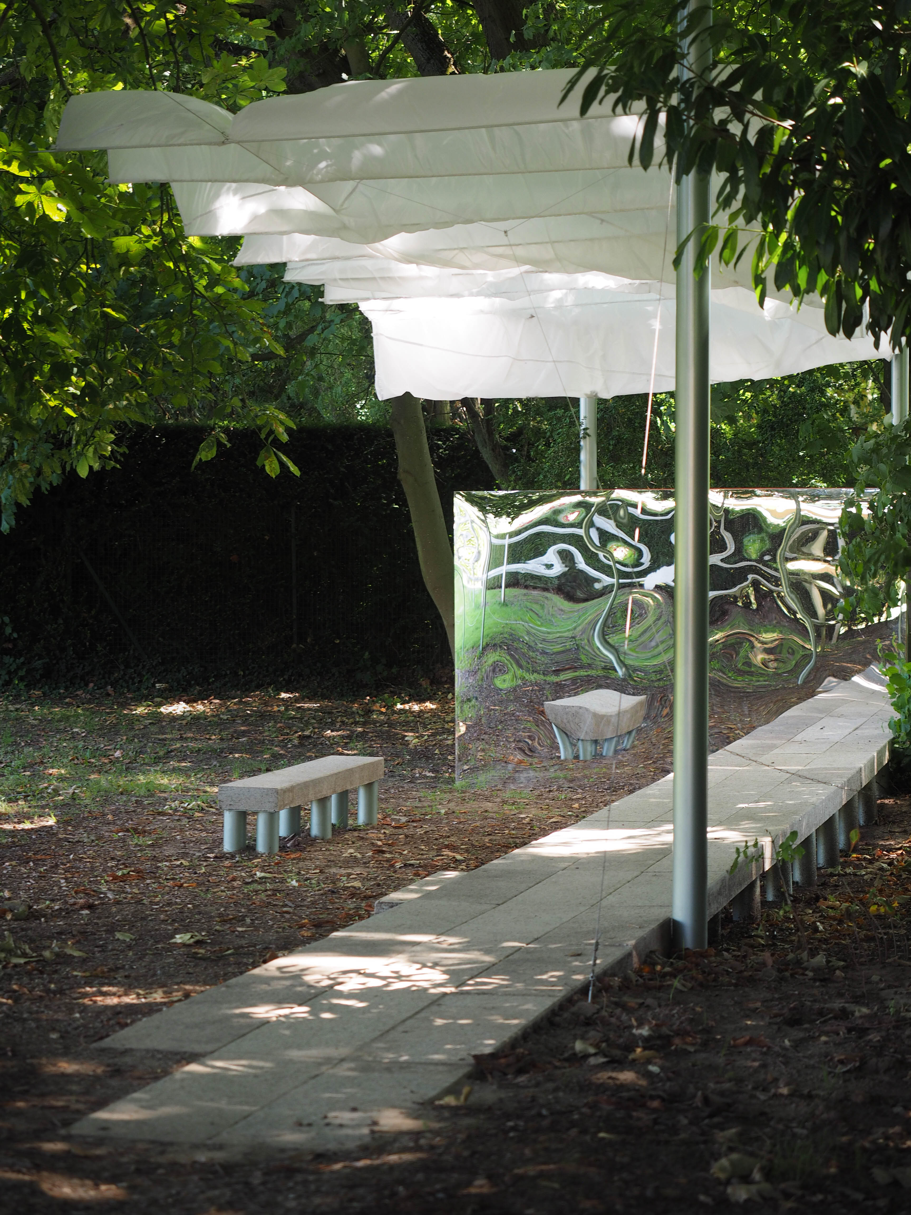 La construction s’inscrit dans l’alignement du miroir d’eau. Elle en prolonge le tracé sous la forme d’une jetée surmontée d’une ombrière. La jetée offre un lieu d’assise et de rassemblement en surplomb de la prairie. Un grand miroir, reprenant la largeur du bassin, est installé verticalement en butée des blocs de pierre. Cet écran conclut l’aménagement, autant qu’il en prolonge l’image et accentue l’effet de perspective. Au registre minéral, constitué de blocs de granit blanc sarde de réemploi, s’ajoute un registre léger. Celui-ci est constitué de mats métalliques portant une toiture textile amovible. Réalisée à partir d’une toile de parachute, l’ombrière est déployée en fonction des conditions météorologiques. Une collection de coussins vient compléter le projet et contrer la rudesse du socle en pierre. Il offre, par le jeu d’empilements, le soin au public d’ajuster la forme et la disposition des assises. Enfin, le paysage alentour est travaillé en tonte différenciée, marquant l’emprise d’une petite clairière sous le hêtre pourpre emblématique du jardin.