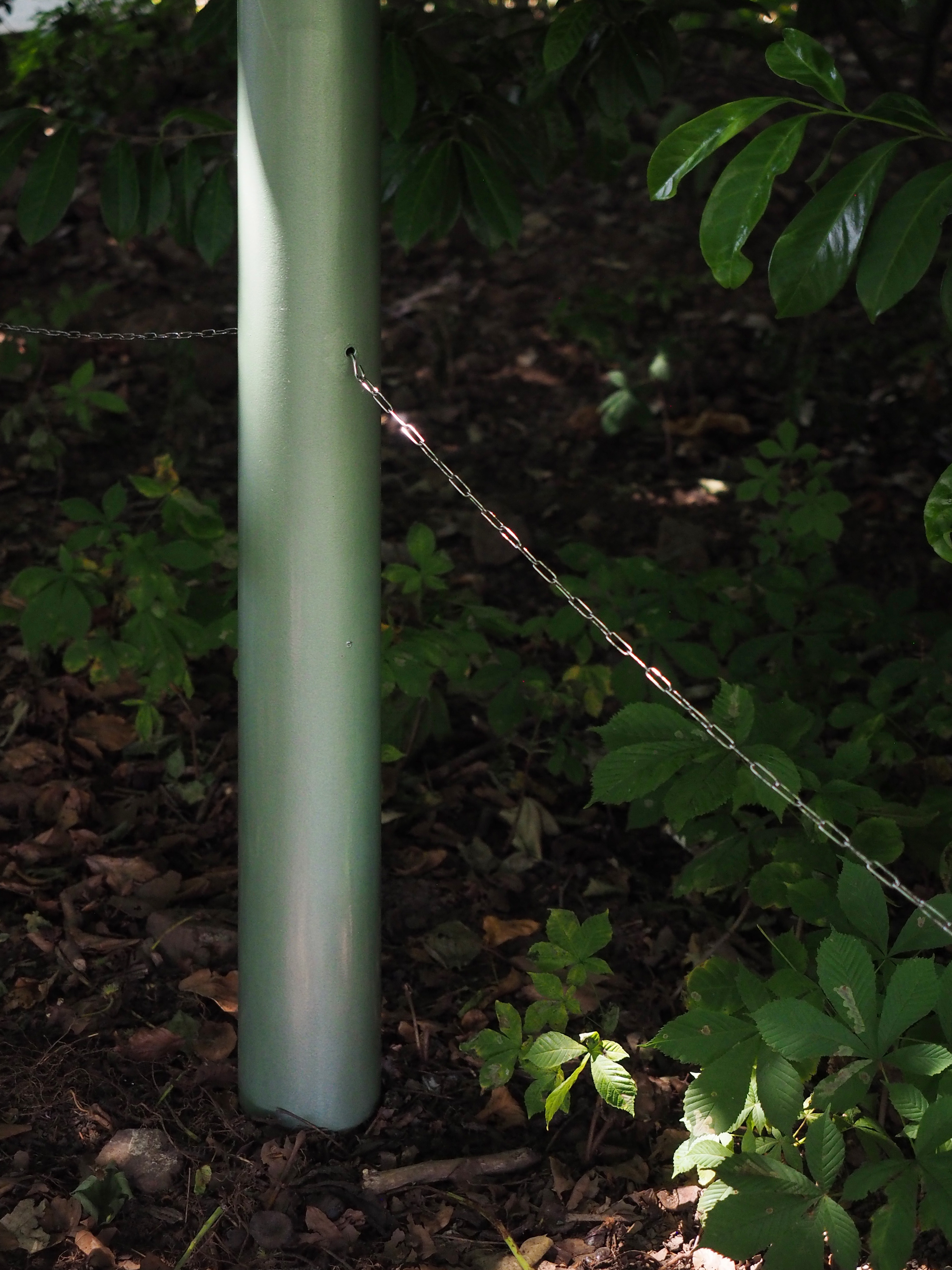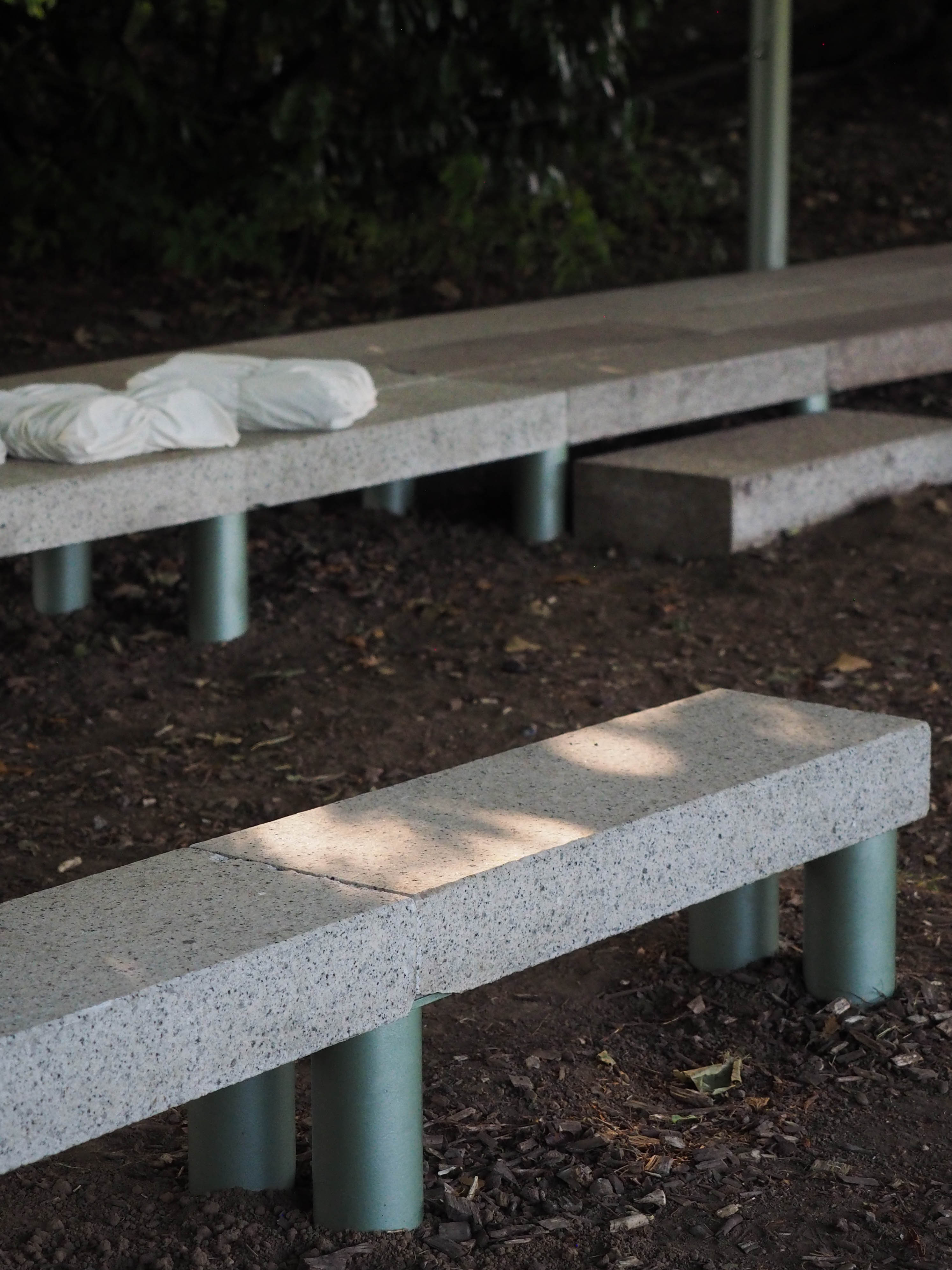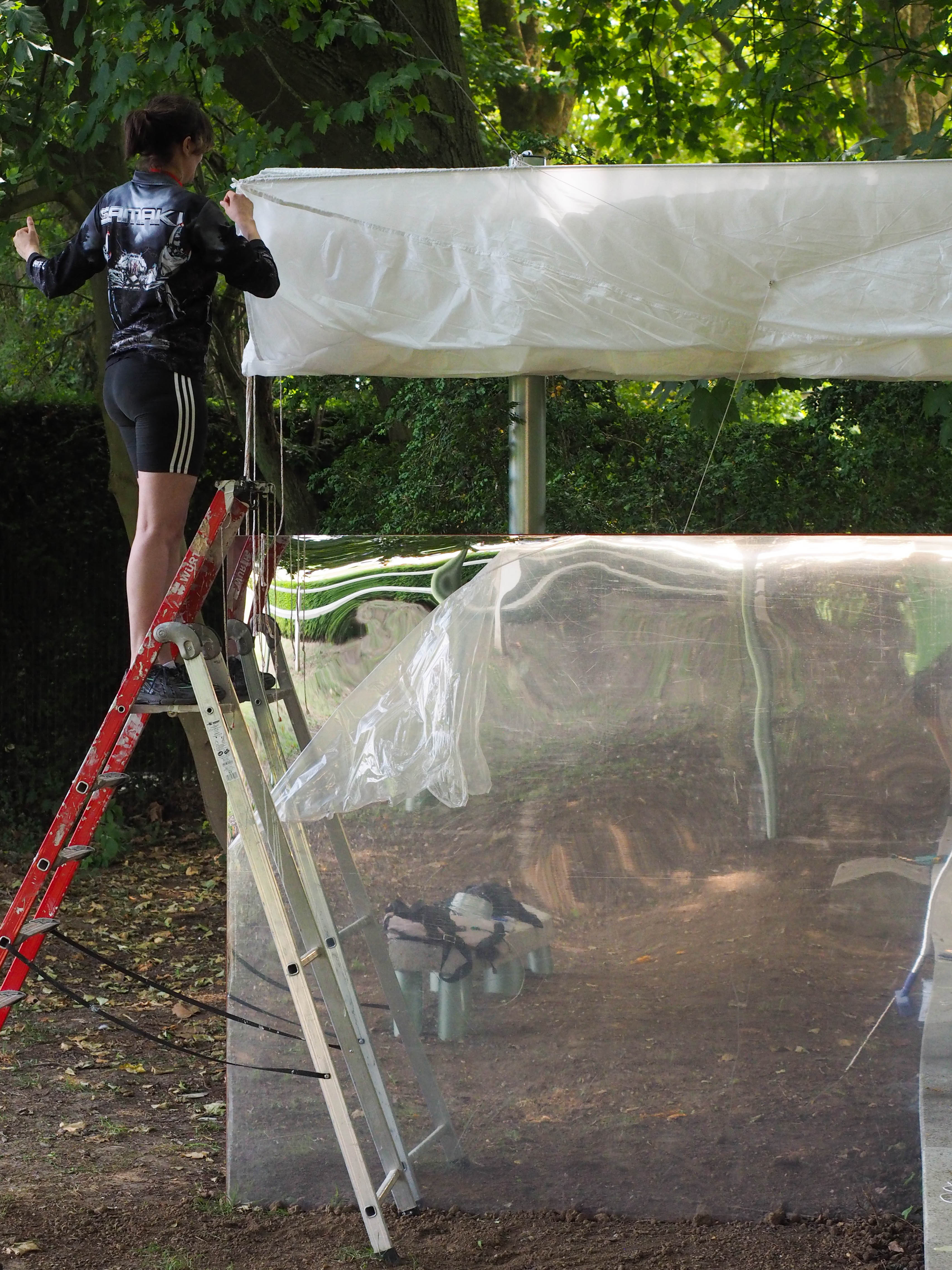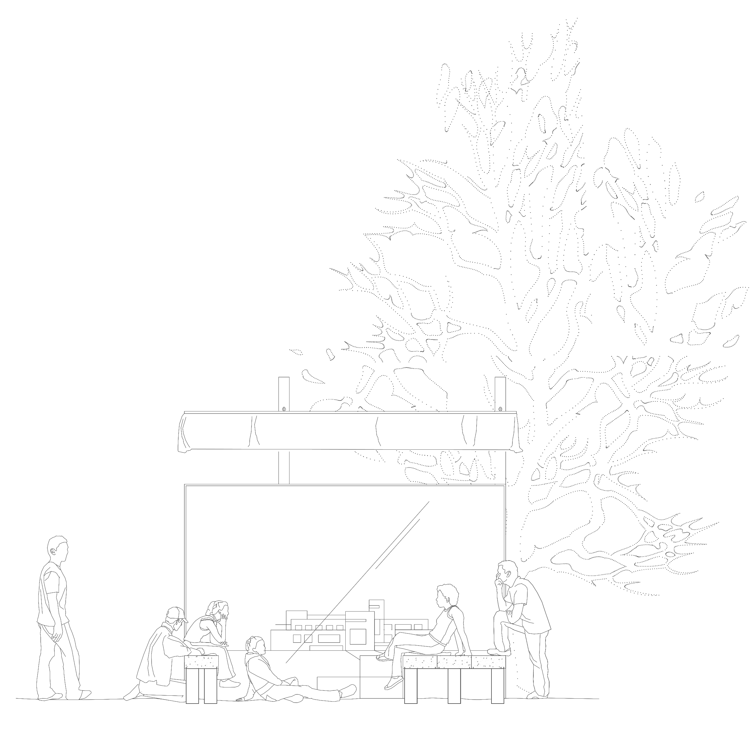 La construction s’inscrit dans l’alignement du miroir d’eau. Elle en prolonge le tracé sous la forme d’une jetée surmontée d’une ombrière. La jetée offre un lieu d’assise et de rassemblement en surplomb de la prairie. Un grand miroir, reprenant la largeur du bassin, est installé verticalement en butée des blocs de pierre. Cet écran conclut l’aménagement, autant qu’il en prolonge l’image et accentue l’effet de perspective. Au registre minéral, constitué de blocs de granit blanc sarde de réemploi, s’ajoute un registre léger. Celui-ci est constitué de mats métalliques portant une toiture textile amovible. Réalisée à partir d’une toile de parachute, l’ombrière est déployée en fonction des conditions météorologiques. Une collection de coussins vient compléter le projet et contrer la rudesse du socle en pierre. Il offre, par le jeu d’empilements, le soin au public d’ajuster la forme et la disposition des assises. Enfin, le paysage alentour est travaillé en tonte différenciée, marquant l’emprise d’une petite clairière sous le hêtre pourpre emblématique du jardin.