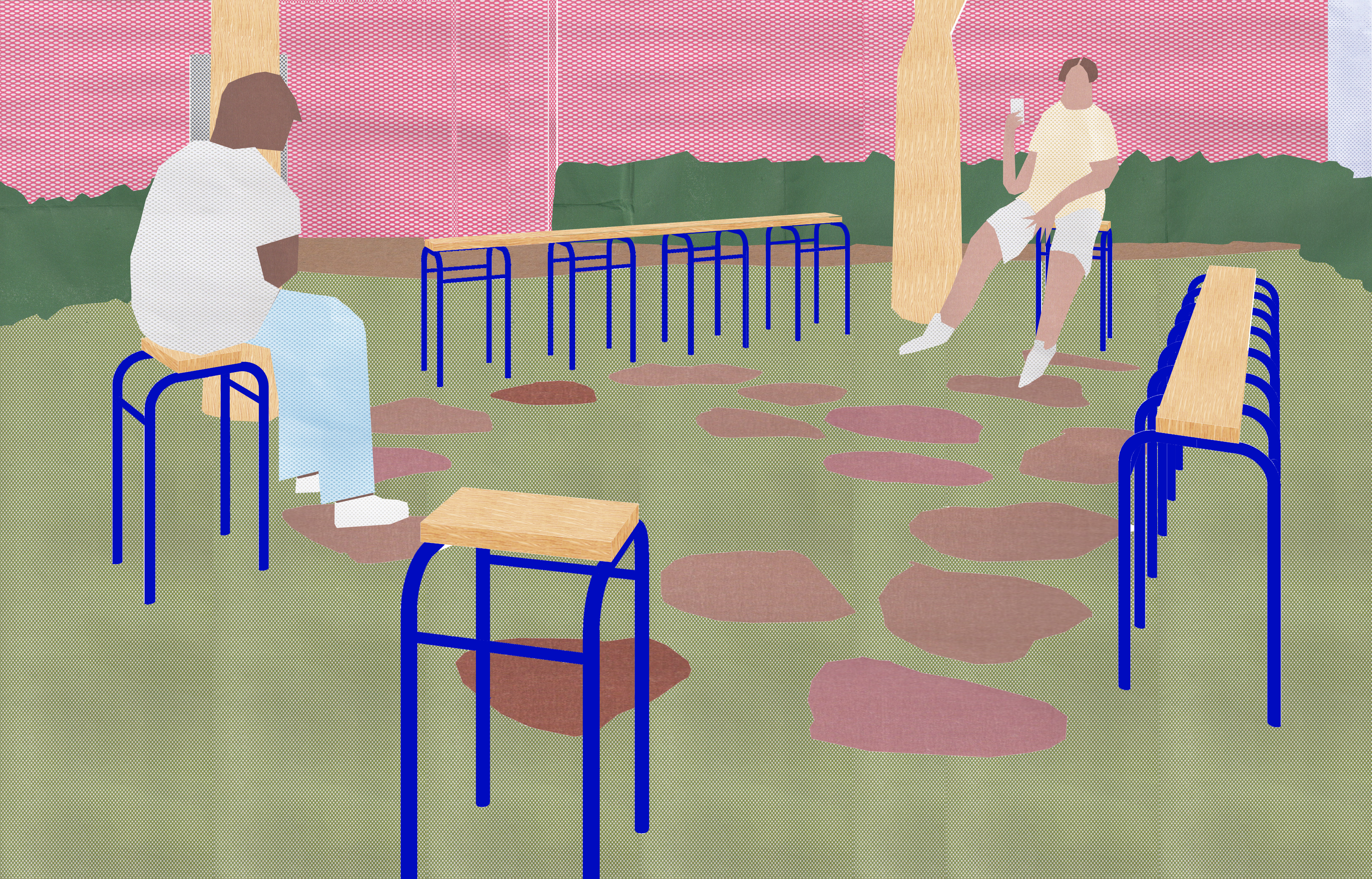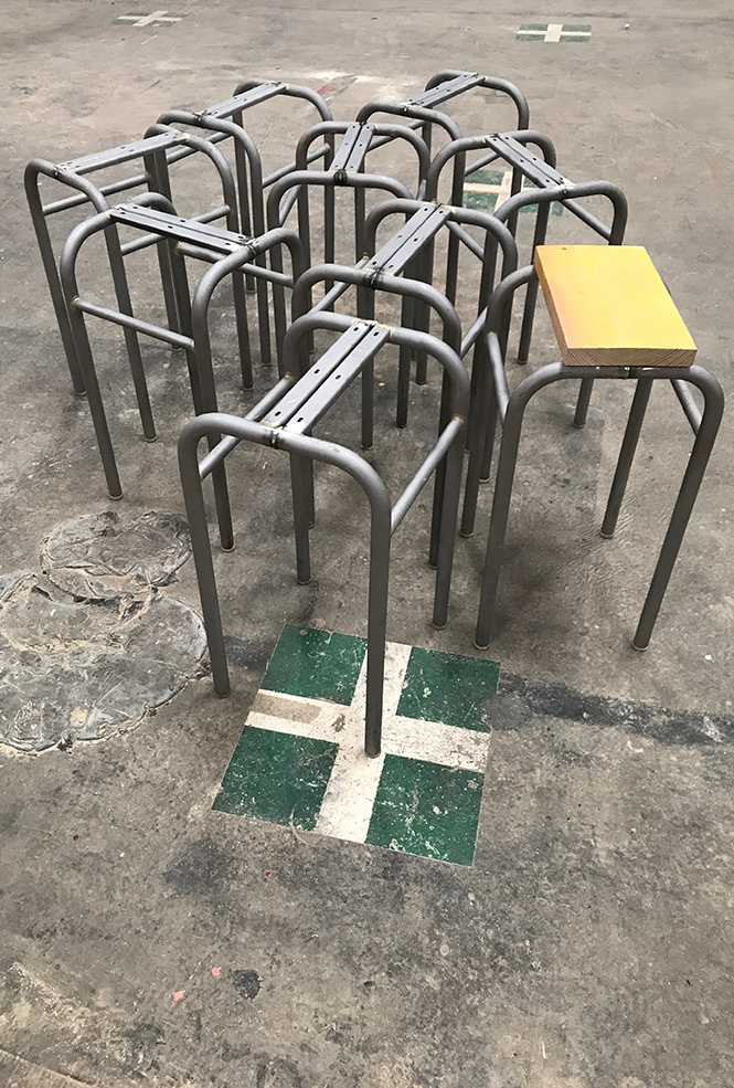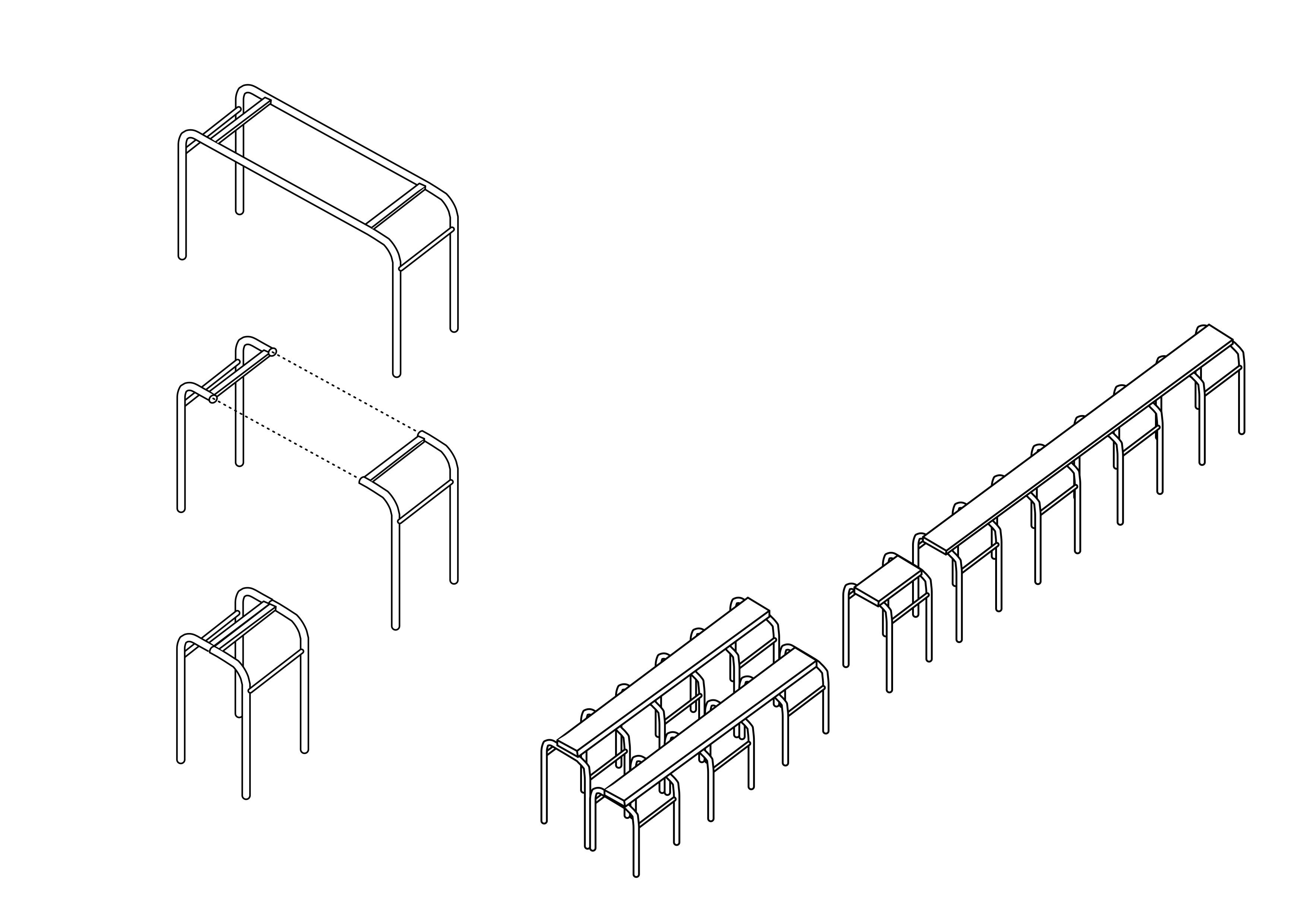Le projet, qui vise un objectif élevé de réemploi, s’appuie en premier lieu sur les gisements disponibles dans l’enceinte de l’établissement, puis se fournit en dehors pour compléter le sourçage. L’aménagement est ainsi réalisé à partir d’anciennes tables d’école et de planches d’échafaudage. Les structures tubulaires sont découpées et soudées pour former de nouveaux volumes surmontés de bois. Ces modules forment un ensemble de bancs, tabourets et tribunes, qui deviennent de nouveaux supports aux jeux et activités de la cour de récré.