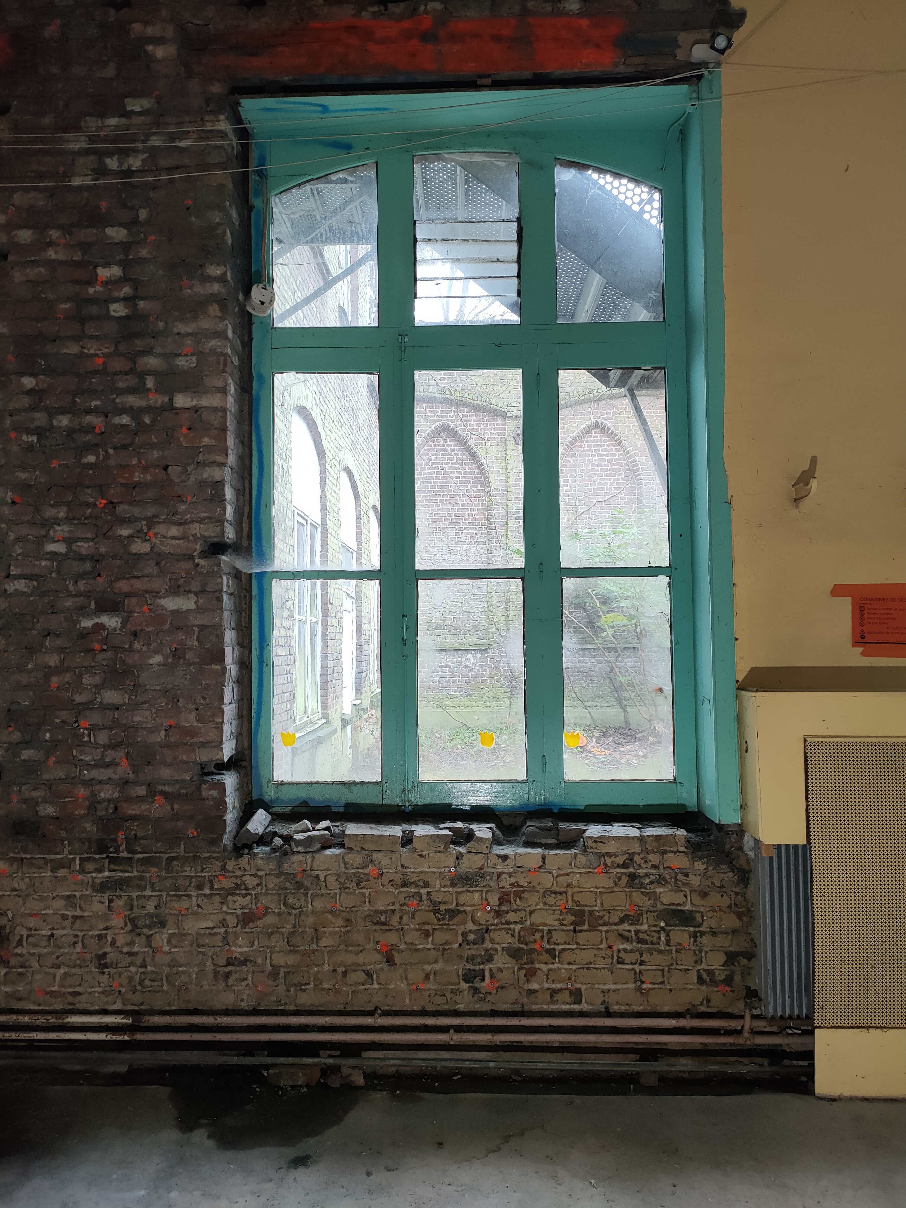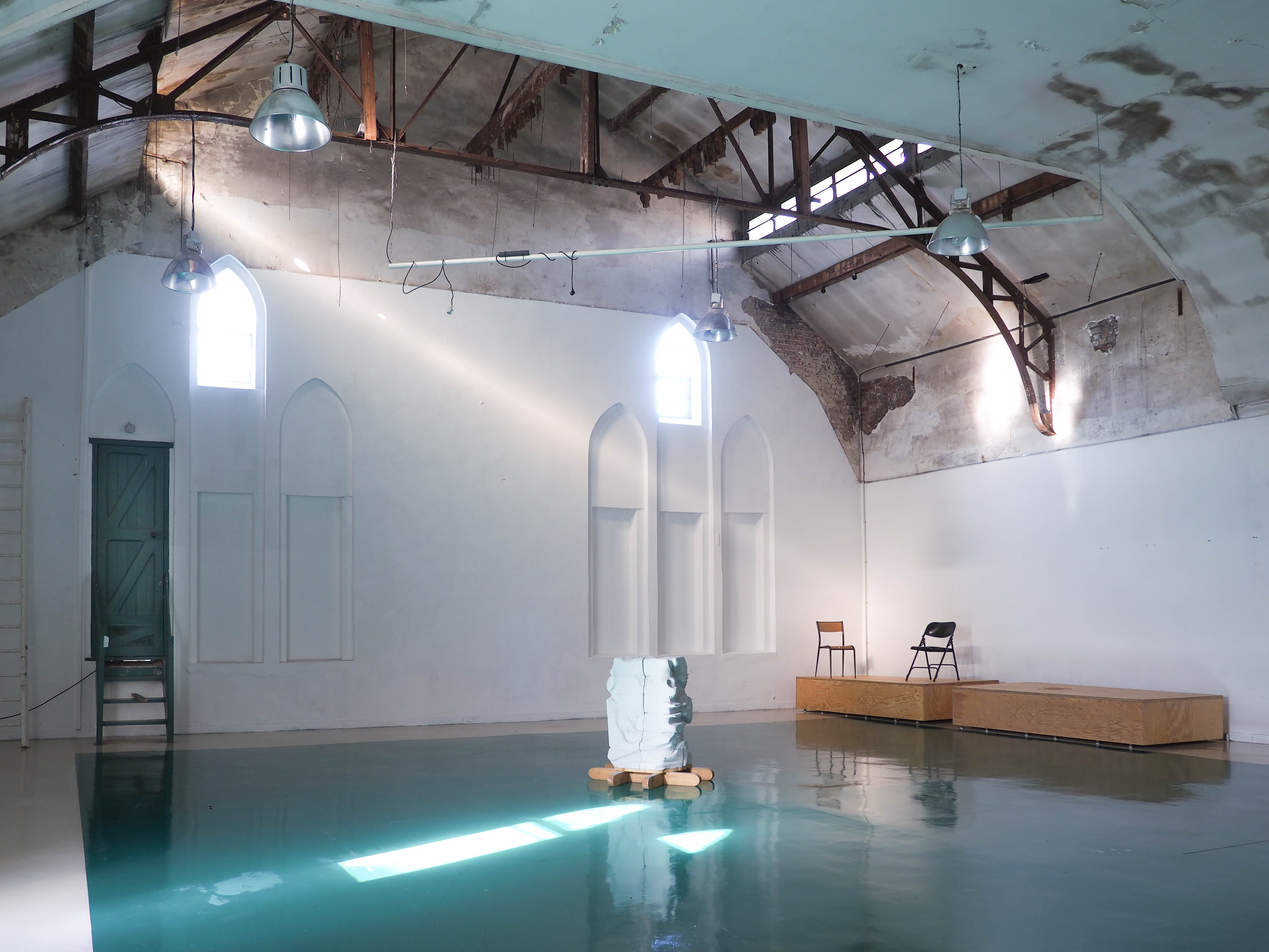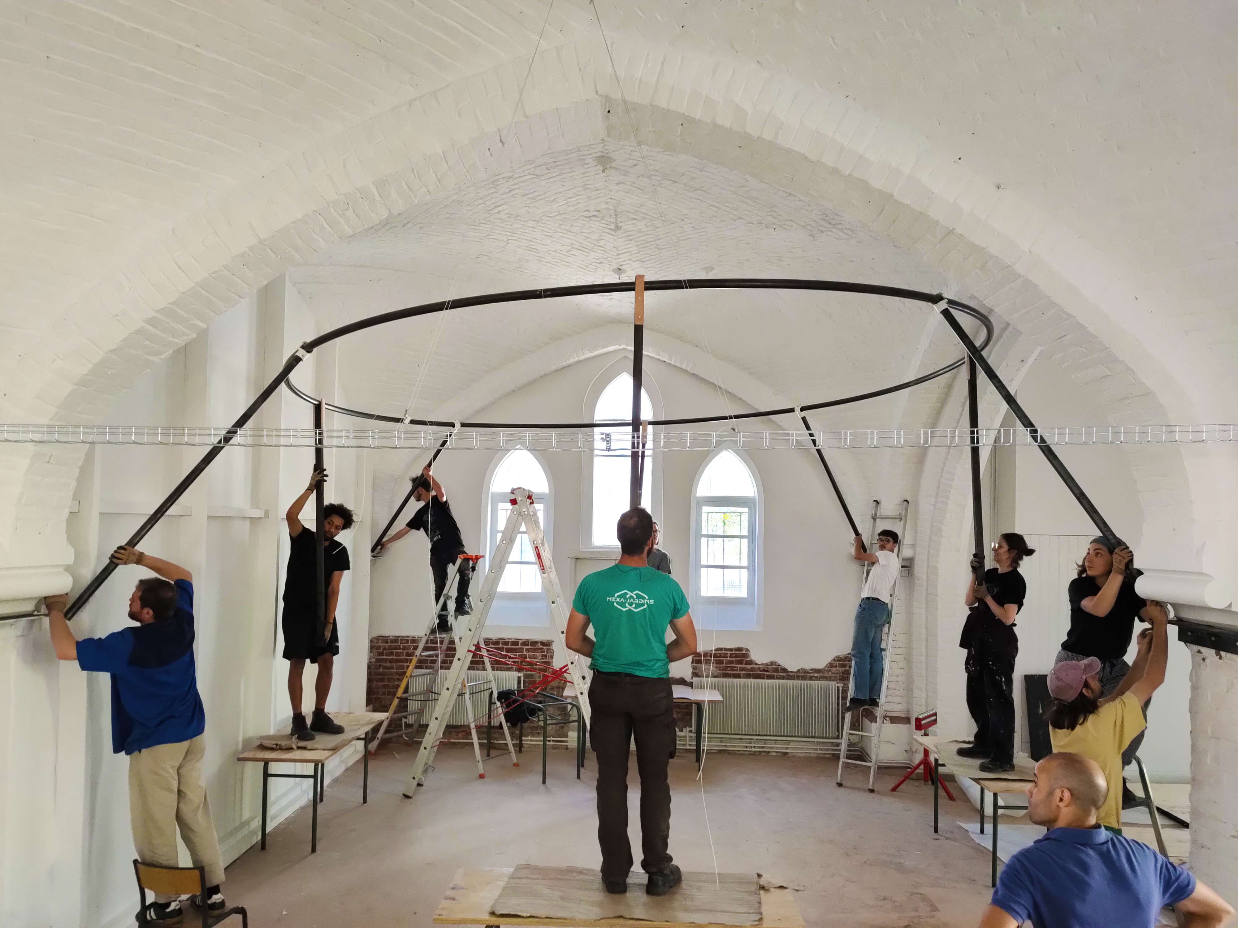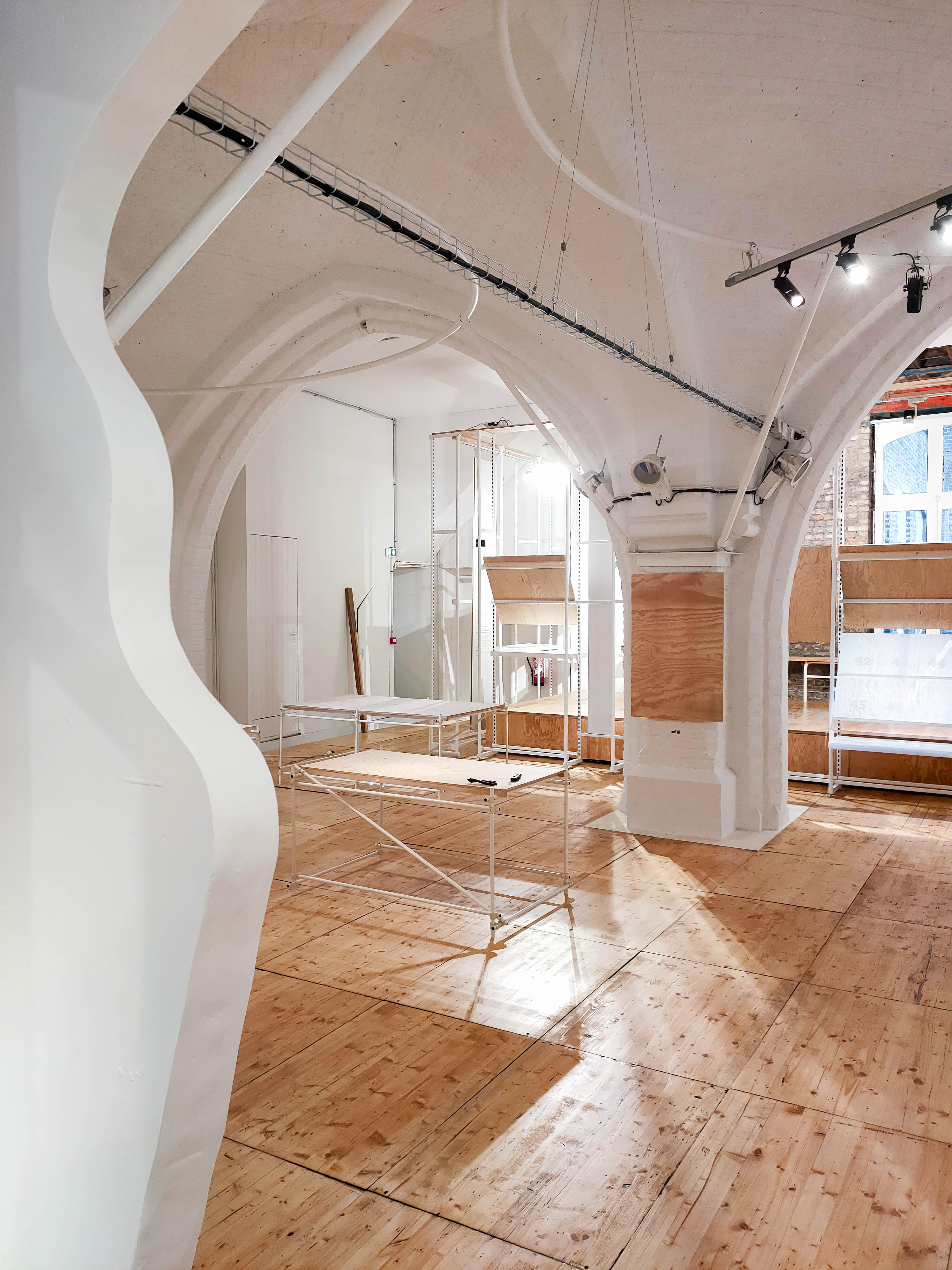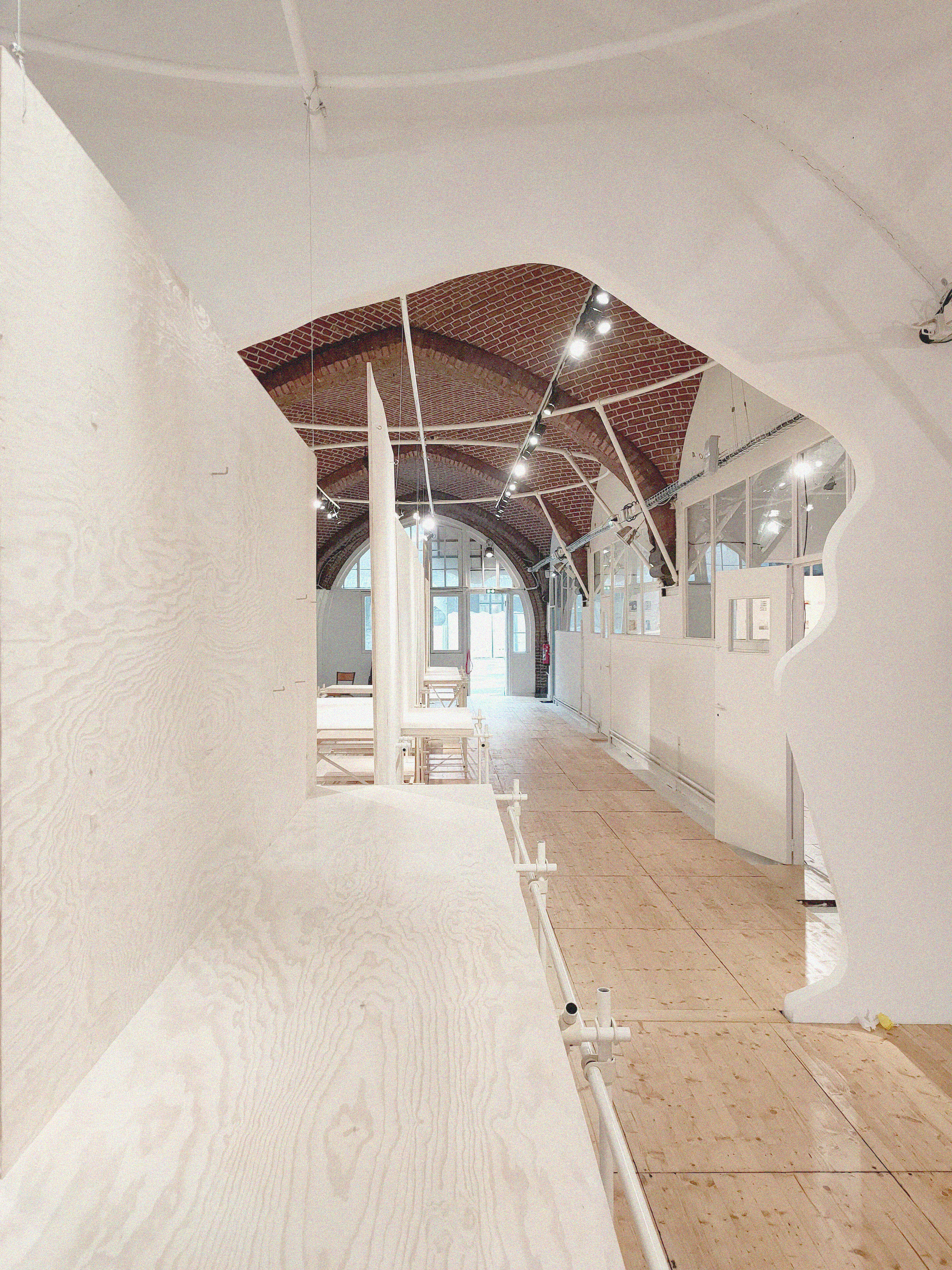 L’aménagement s’appuie sur un curage préalable qui vise à décloisonner les anciennes salles de classes. De grands plateaux sont obtenus, rythmés par un système porteurs en voûtes de briques. Dans le cadre de son inscription au registre des Monuments Historiques, la marge d’intervention sur l’édifice est limitée et invite à composer avec la trace des époques passées. La réhabilitation et les supports de scénographie sont majoritairement pensés en réemploi. Un nouveau revêtement de sol en bois massif, issu de l’Opéra de Lille, est installé. Des cloisons sont déplacées, percées ou construites par anticipation des futures utilisations de la salle. Plusieurs estrades, scènes et socles sont réalisés à partir de système d’assemblage réversibles et démontables empruntés au collectif Open Structures. Un gril technique, fait de grands anneaux cintrés puis soudés sur place, permet la suspension des éclairages, projecteurs et autres systèmes de diffusion sonore, autant qu’il sert à la suspension d’œuvres ou la mise au noir de sous-espaces.