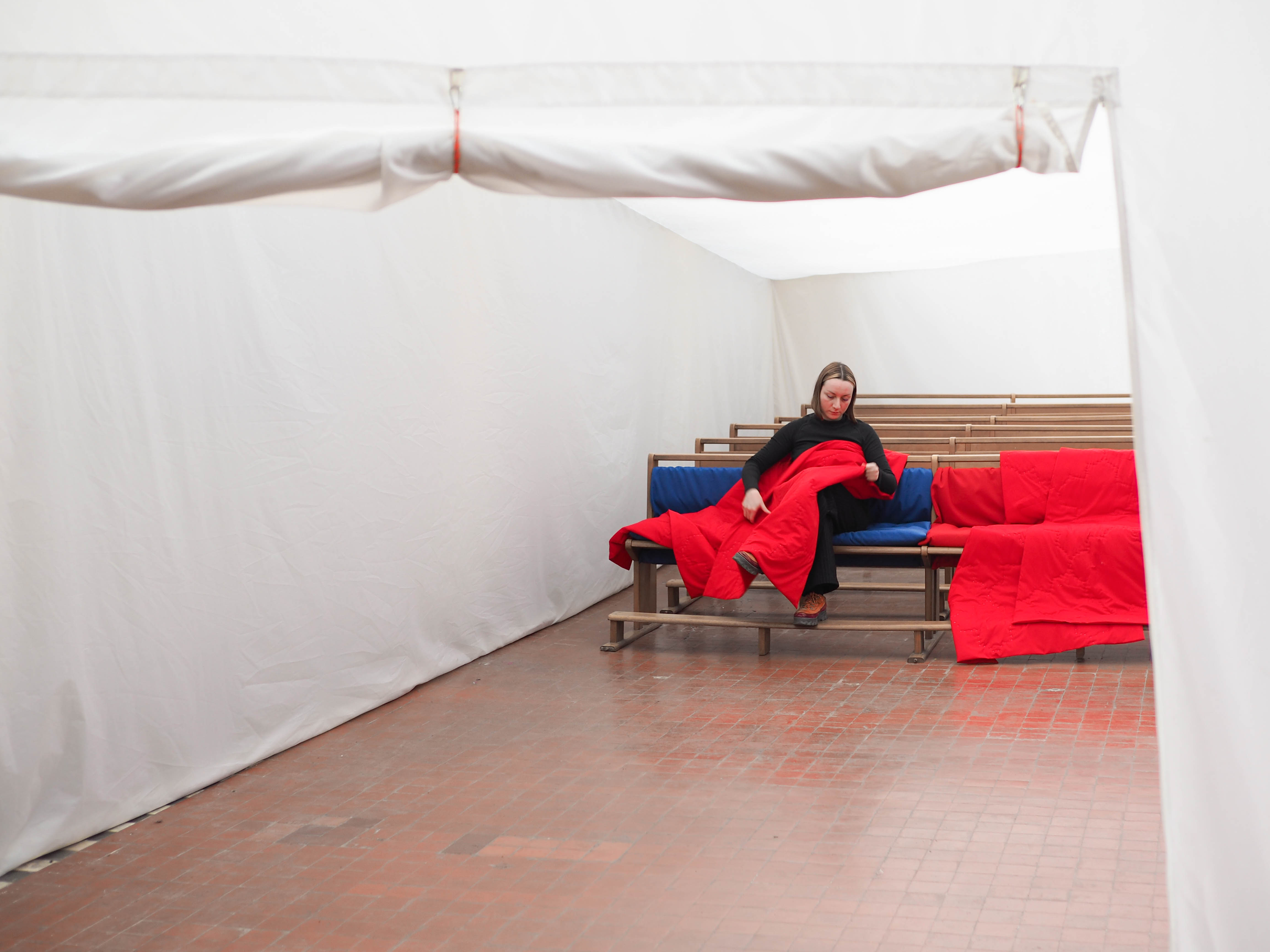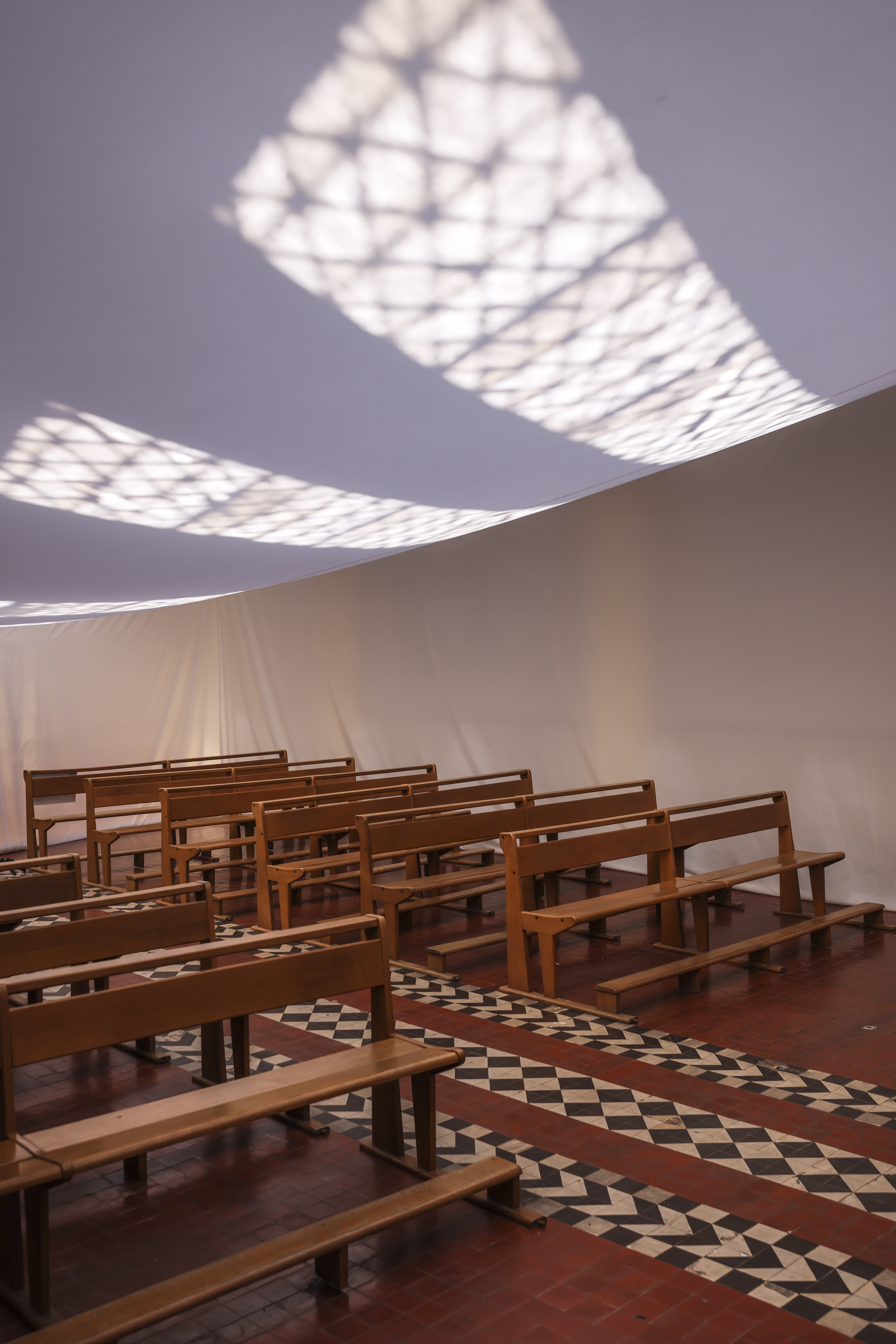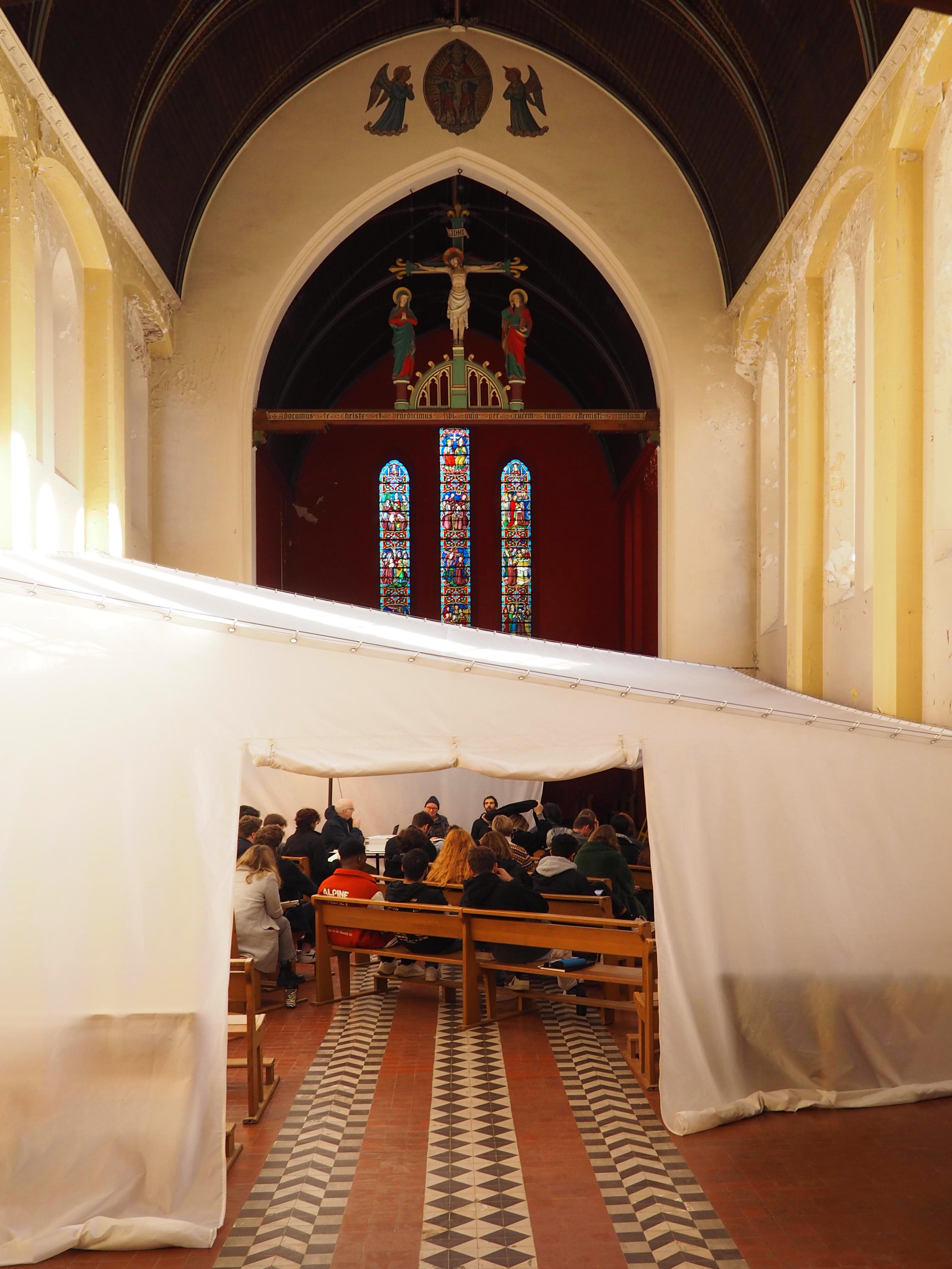 A cela s’ajoute, une collaboration avec le bureau d’architecture Rotor, invité à réaliser un aménagement thermique dans la chapelle du monastère. Celui-ci répond, dans le temps de l’exposition, au besoin d’accueillir un cycle de conférence et sur le long-terme à celui d’exploiter cet espace par temps froid. Zerm produit un cahier des charges très contraint, qui réunit les attentes du commissariat d’exposition avec celles de la DRAC qui veille à la préservation des monuments historiques. Il en résulte une installation textile réversible pouvant être déployée par temps froid et rangée à la belle saison. Cette grande tente thermique, ne touche à l’existant qu’en quatre points ponctuels et déploie un espace chauffable au volume réduit.