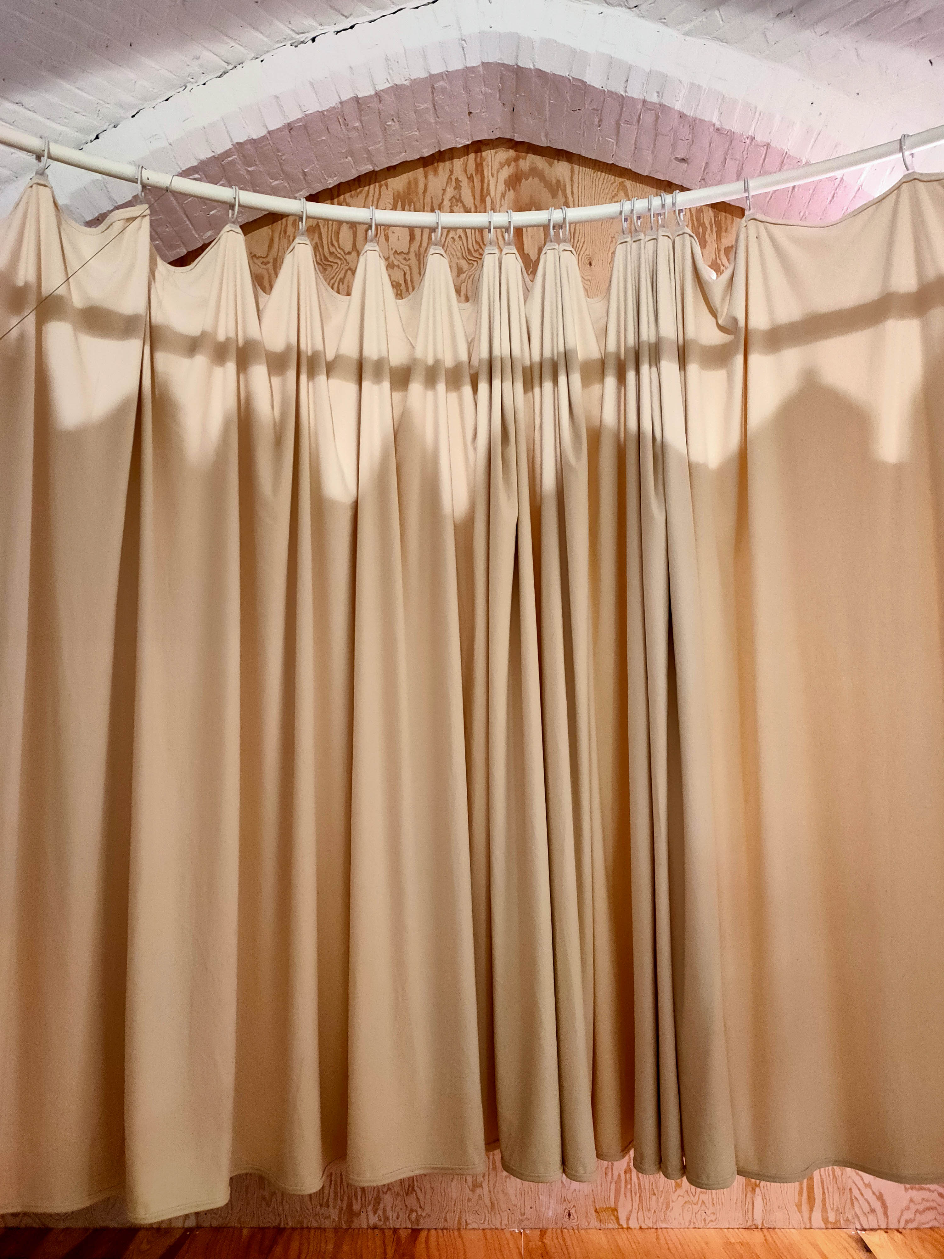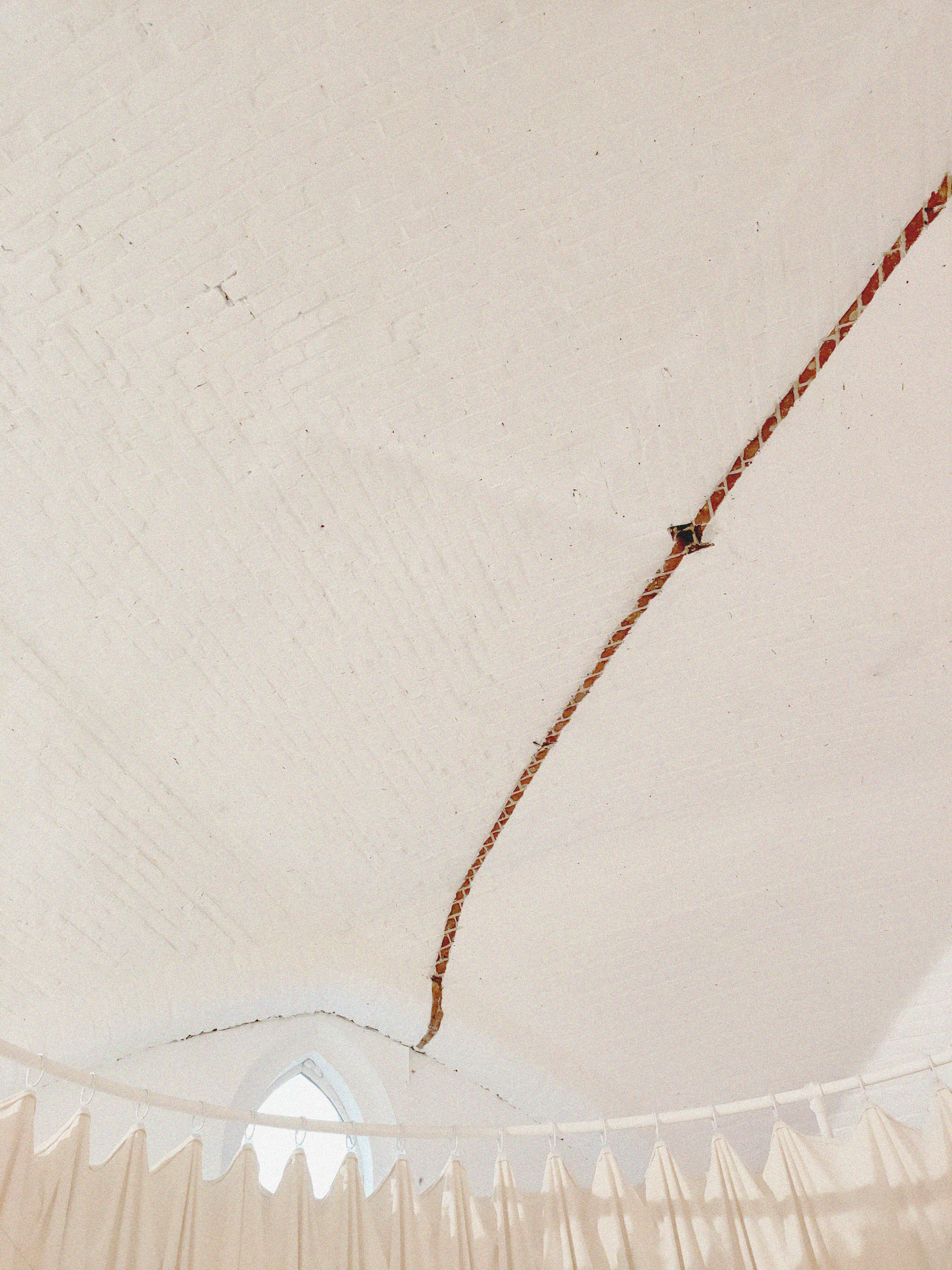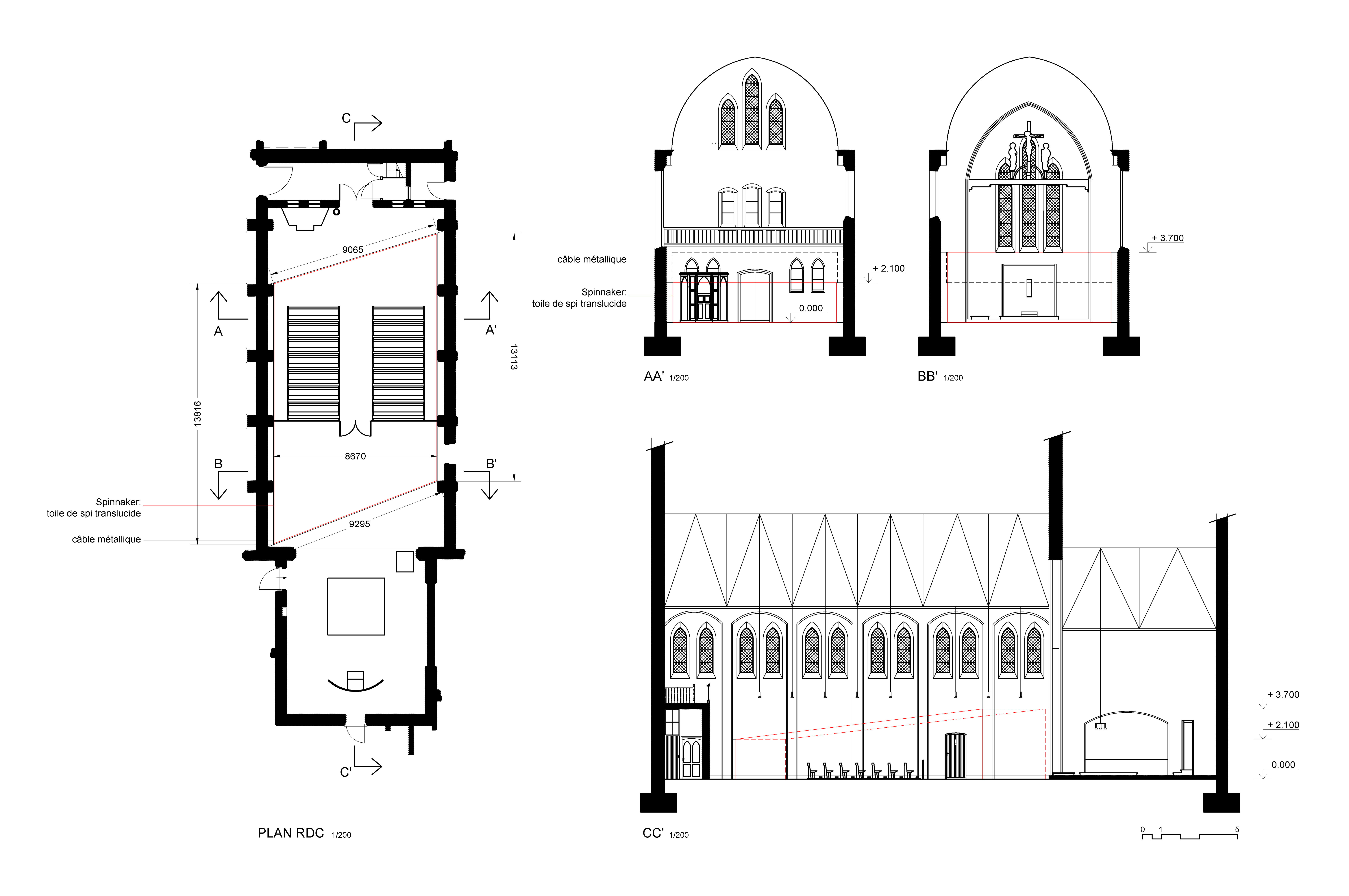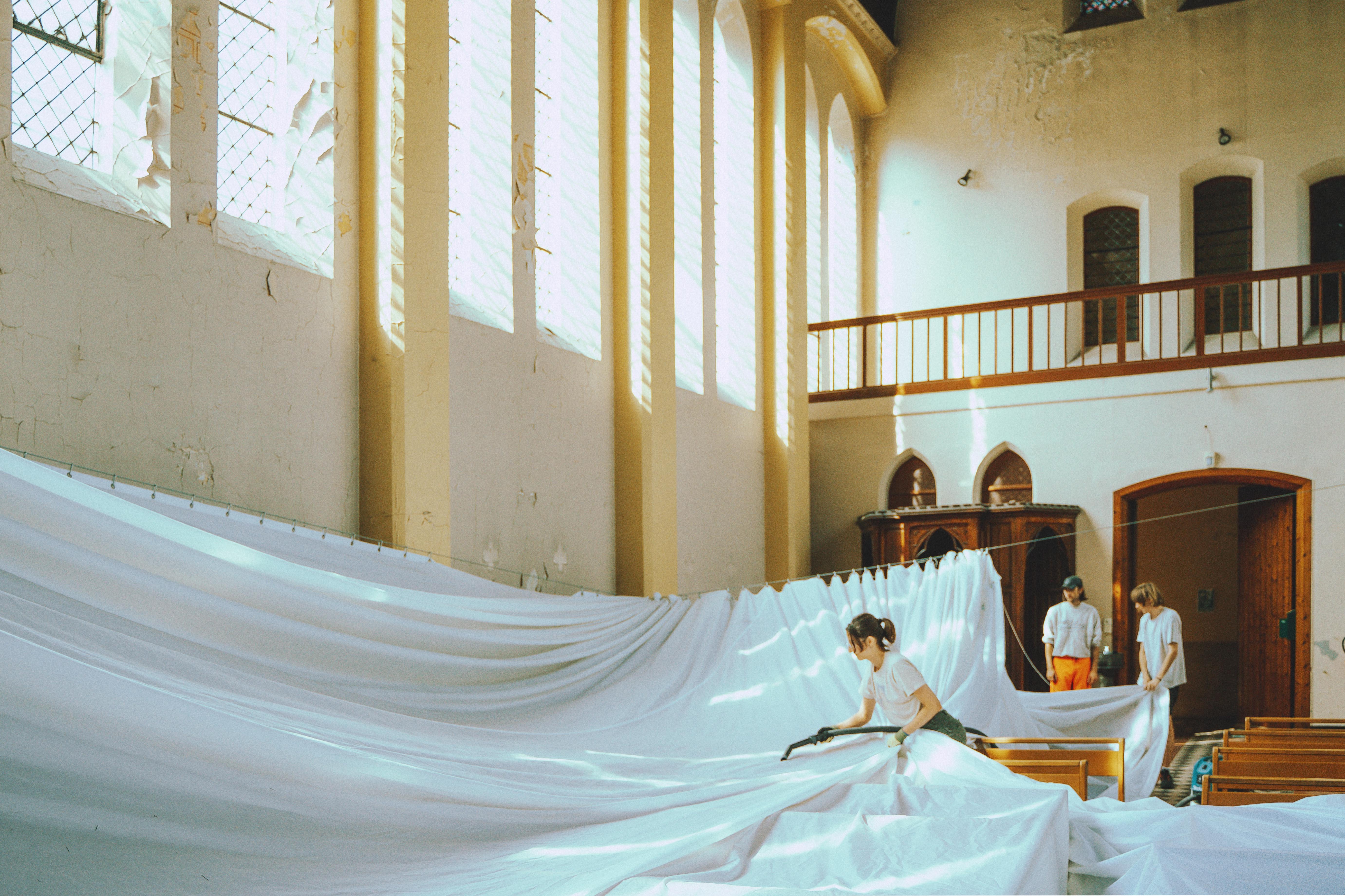 A cela s’ajoute, une collaboration avec le bureau d’architecture Rotor, invité à réaliser un aménagement thermique dans la chapelle du monastère. Celui-ci répond, dans le temps de l’exposition, au besoin d’accueillir un cycle de conférence et sur le long-terme à celui d’exploiter cet espace par temps froid. Zerm produit un cahier des charges très contraint, qui réunit les attentes du commissariat d’exposition avec celles de la DRAC qui veille à la préservation des monuments historiques. Il en résulte une installation textile réversible pouvant être déployée par temps froid et rangée à la belle saison. Cette grande tente thermique, ne touche à l’existant qu’en quatre points ponctuels et déploie un espace chauffable au volume réduit.