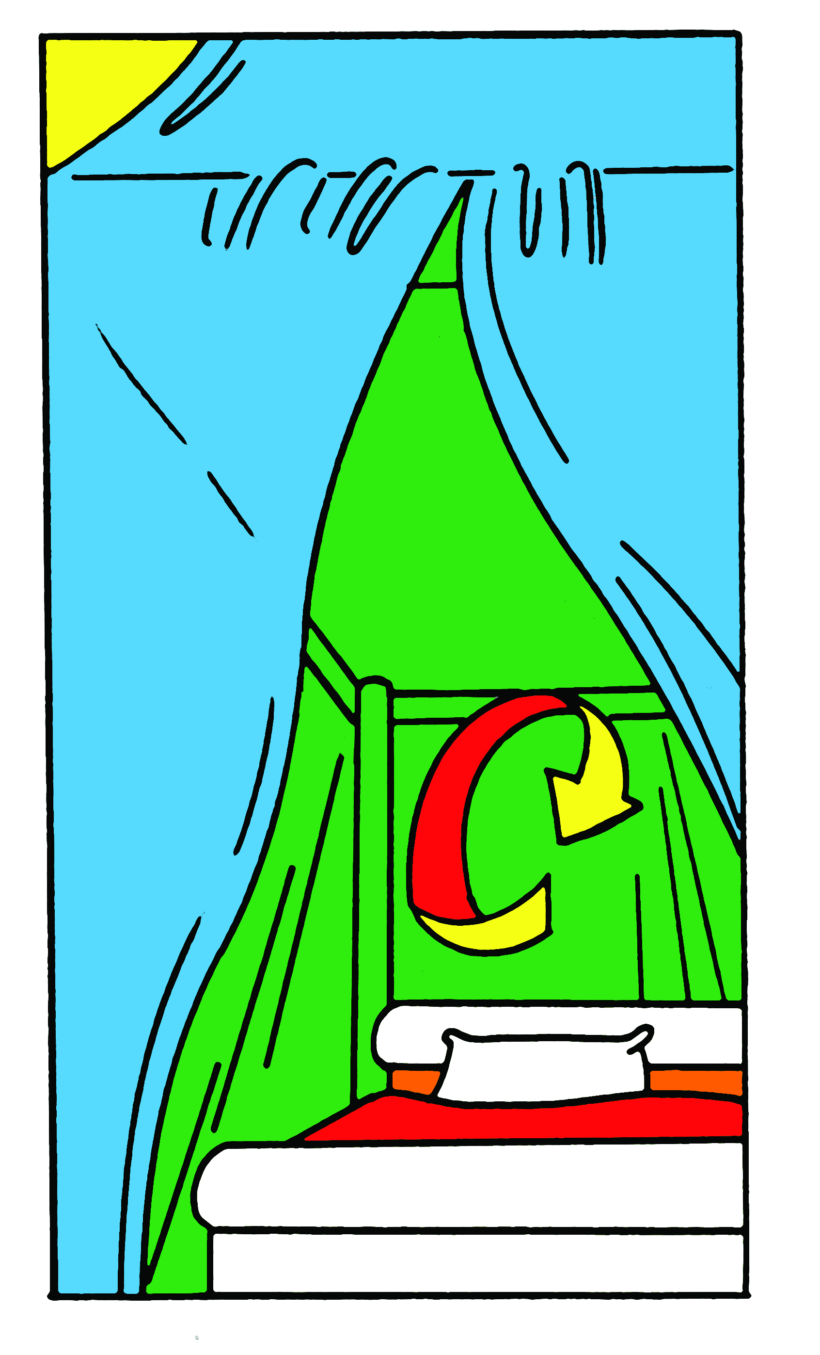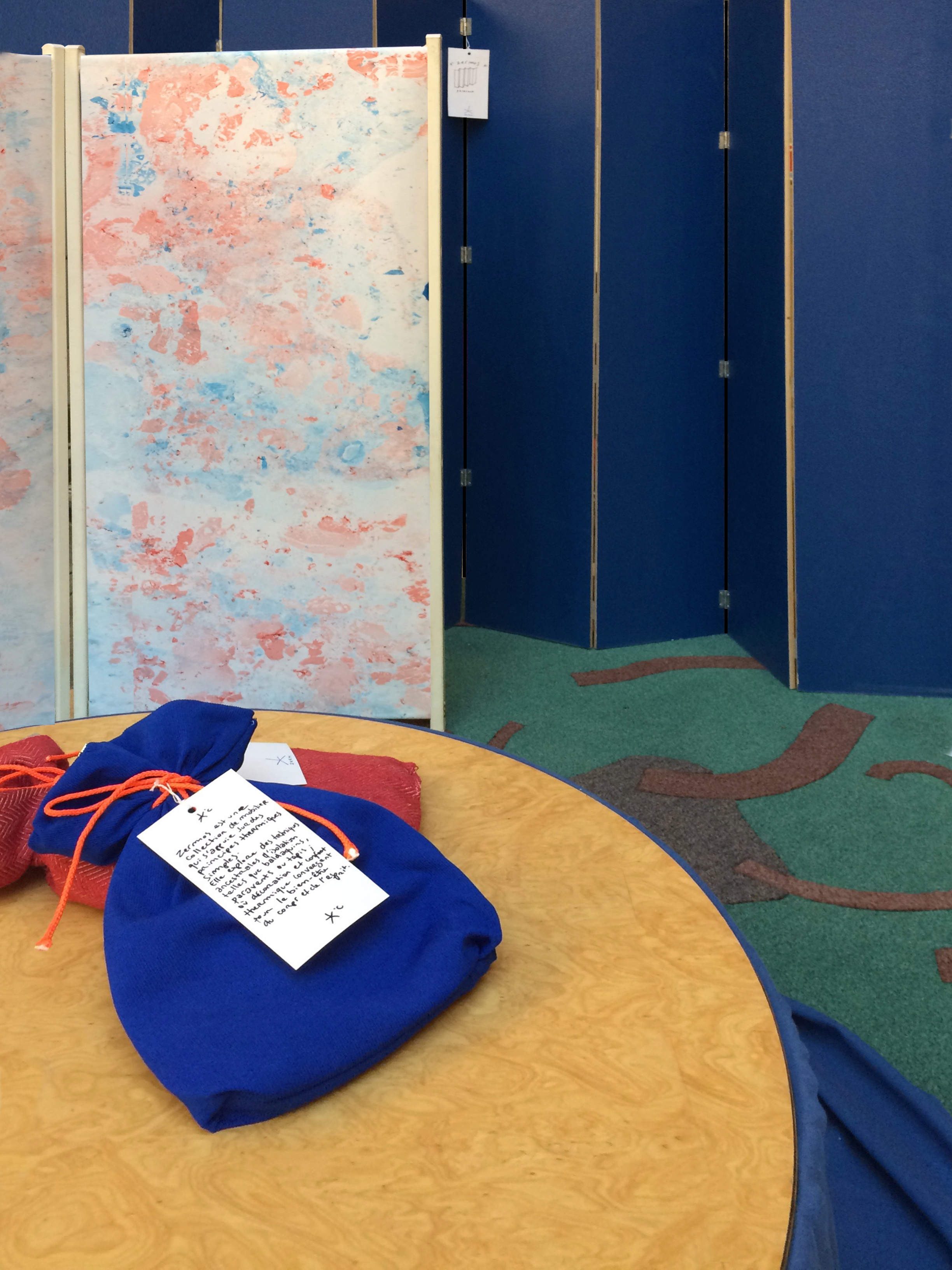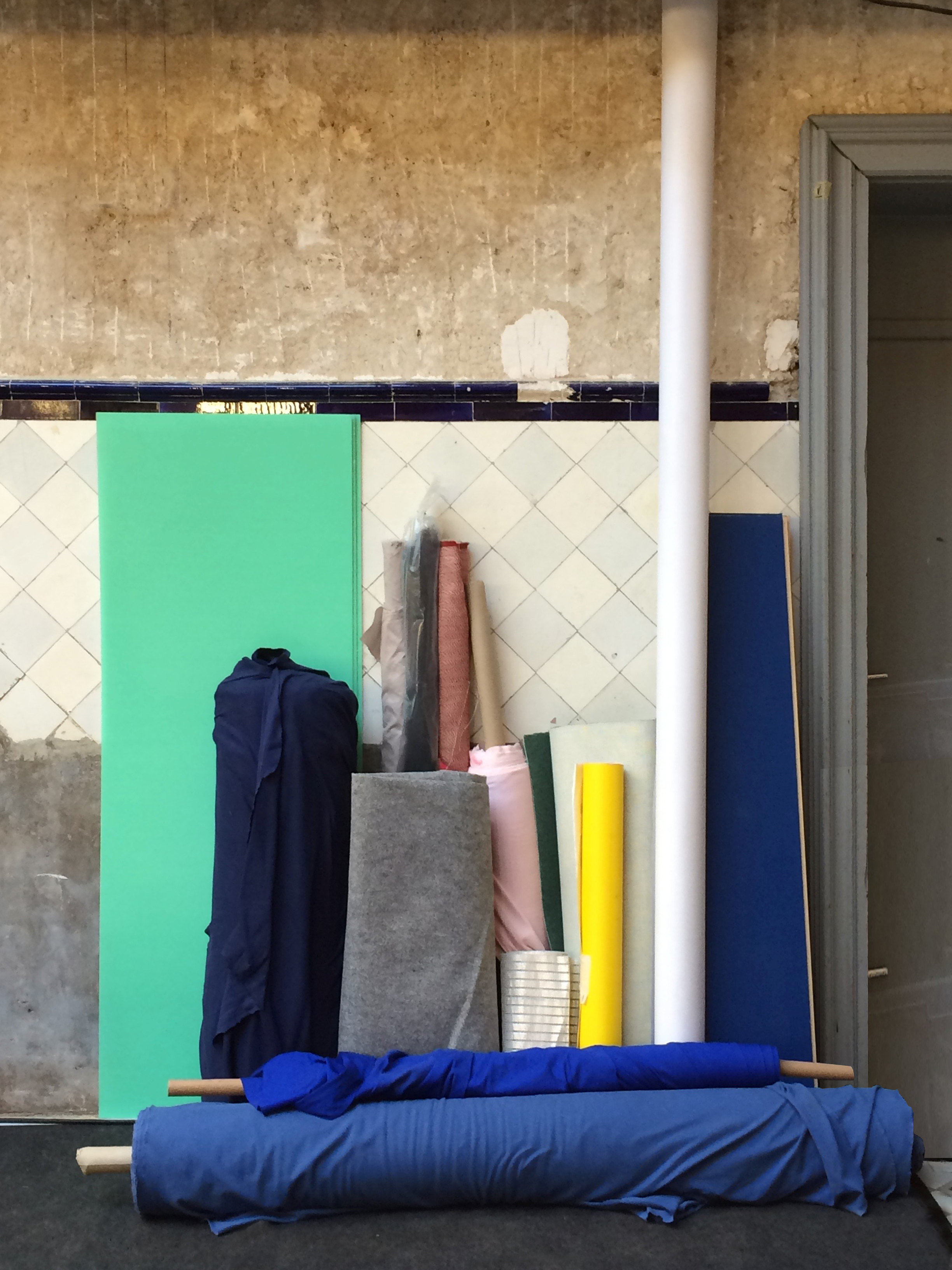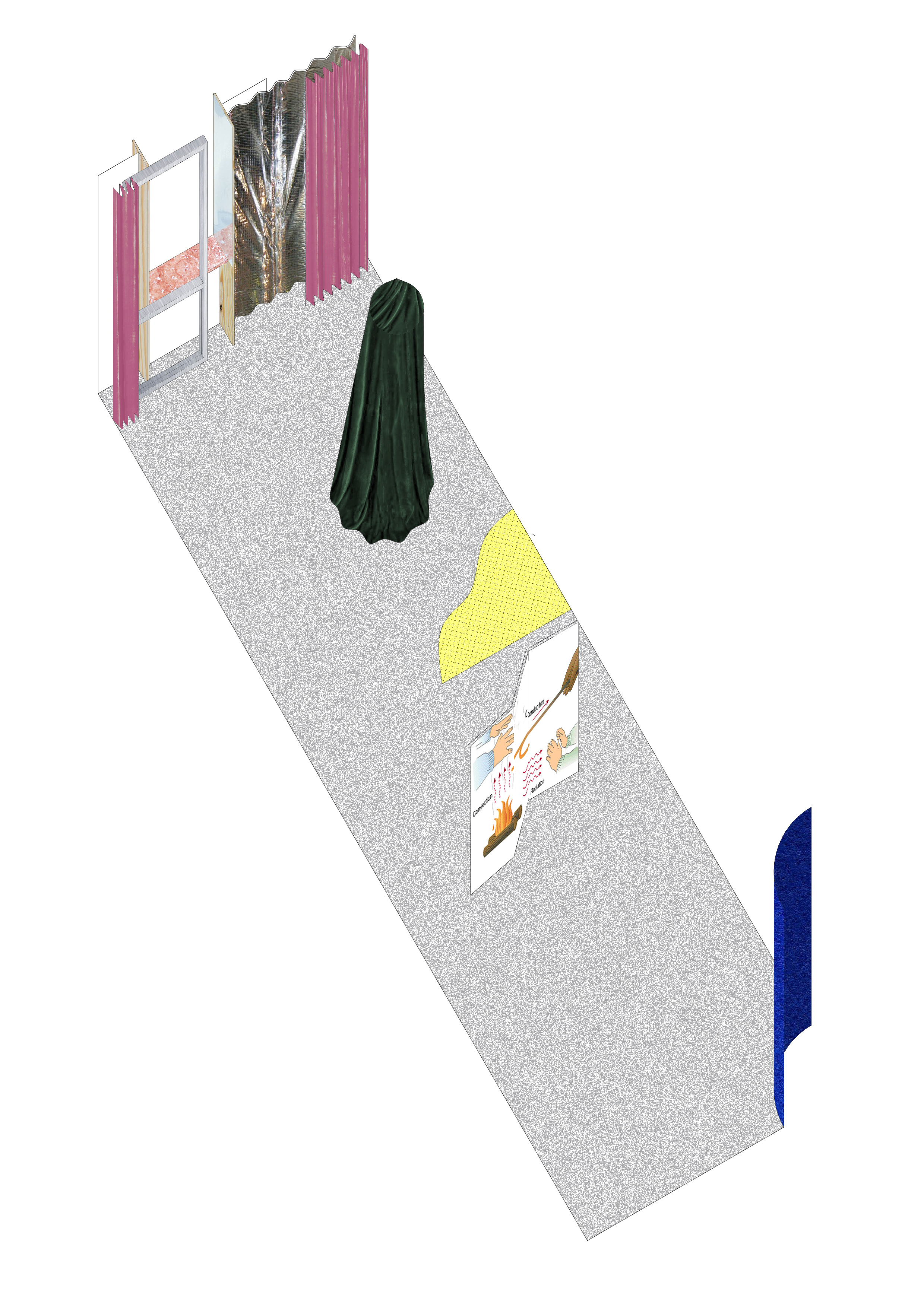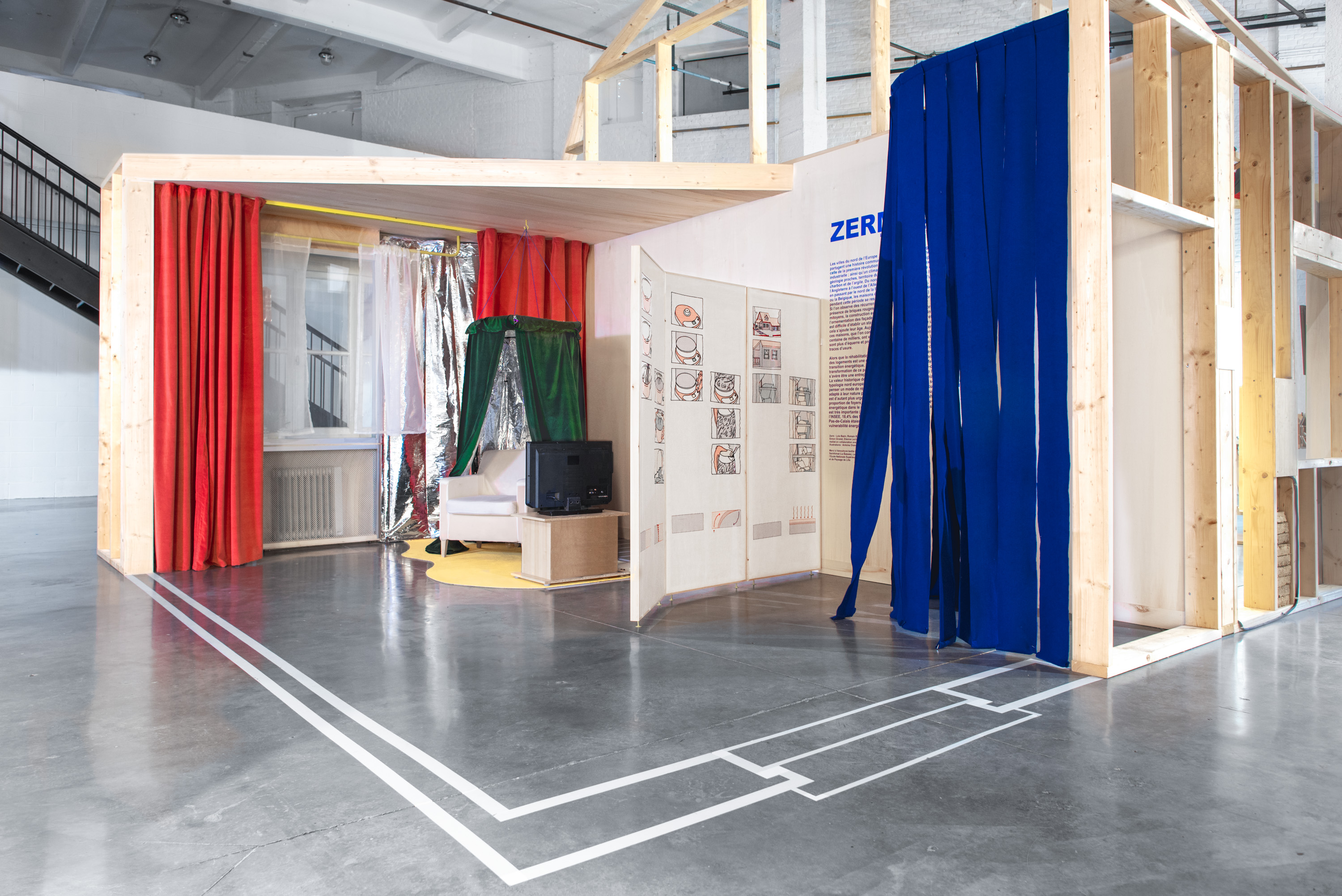 Les dispositifs présentés pour Habitarium, proposent une intervention non-destructive et réversible. Ils agissent comme une isolation ponctuelle et intermédiaire, entre le vêtement que l’on porte et le mur de sa maison. Dans le salon, le corps humain et le soleil sont considérés comme des sources d’énergie optimisées par les dispositifs. Ceux-ci permettent de réduire l’espace à chauffer et scindent la maison en micro-climats. Ici, la protection contre le froid caractérise l’ambiance intérieure par ses textures, ses couleurs, sa matérialité. Particules et ondes du bien-être thermique - les rayons infrarouges, les photons, les courants d’air - deviennent les matériaux de Zermos 2.