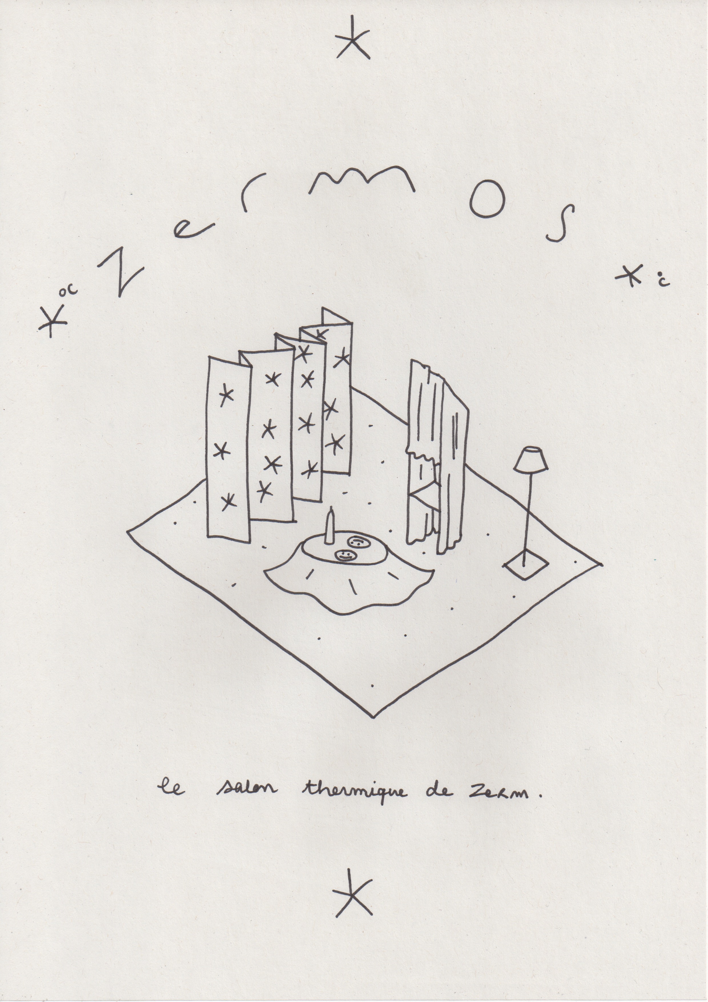 En 2017, Zerm participe à la Braderie de l’Art, une résidence-capsule de 48h de recherche et de création, qui aboutit à la production d’objets d’art ou de design, exposés en fin d’évènement. À cette occasion, Zerm s’interroge sur la pertinence du textile dans la réhabilitation de l’habitat ancien et élabore des prototypes d’isolation légers et modulables, empruntés à l’histoire. Une série d’objets à l’échelle 1:1 : table basse chauffante (kotatsu), paravents, tapis et fauteuil-baldaquin, est ainsi produite et présentée au public. Ces premières investigations marquent le début d’une large recherche sur la thermique et les dispositifs low-tech et anime le travail de Zerm dans la conduite de ses projets. Un an plus tard, le collectif expose son salon thermique Zermos 2 dans l’exposition Habitarium.